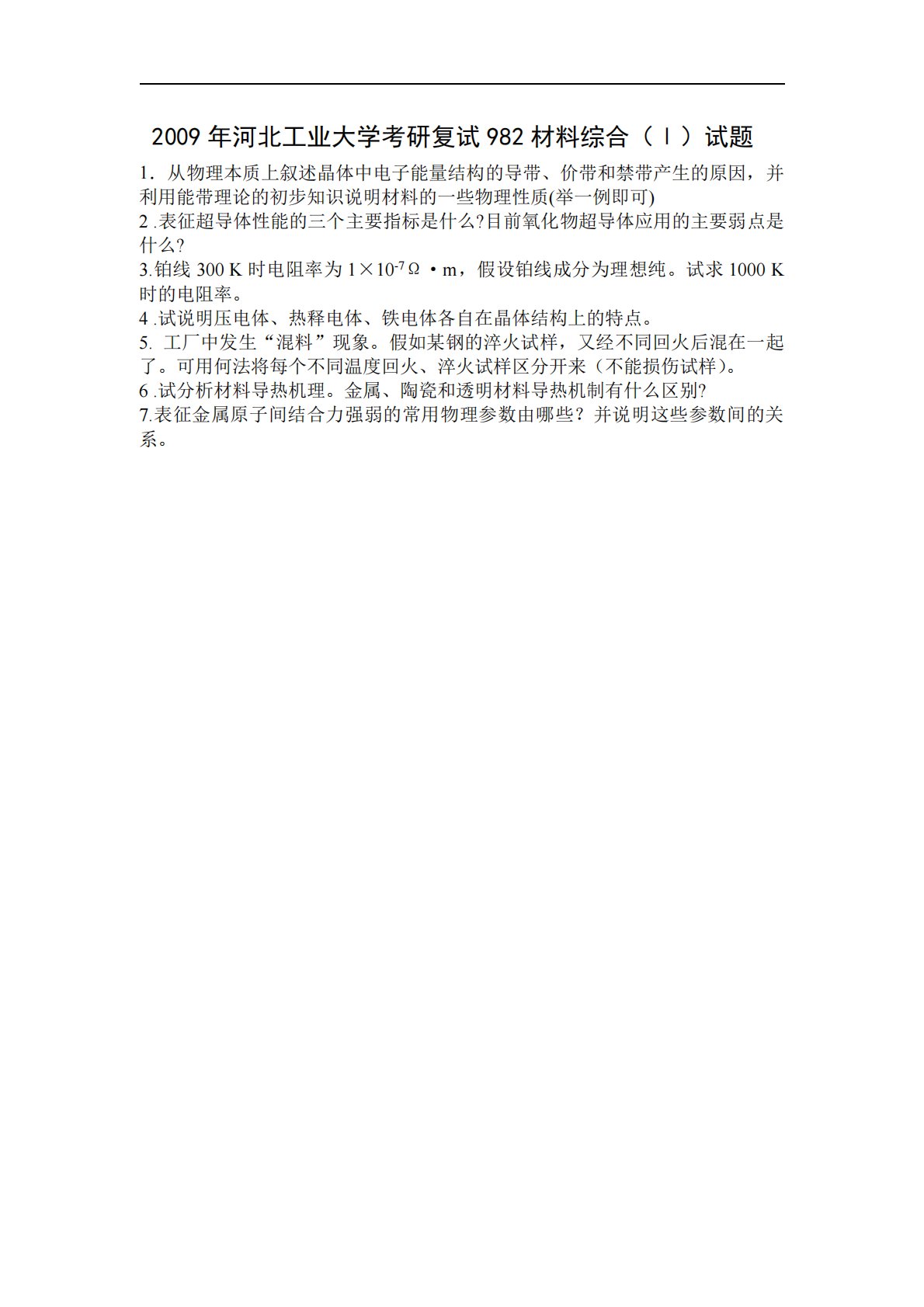 2009年河北工业大学考研复试982材料综合(Ⅰ)试题1.从物理本质上叙述晶体中电子能量结构的导带、价带和禁带产生的原因,并利用能带理论的初步知识说明材料的一些物理性质(举一例即可)2.表征超导体性能的三个主要指标是什么?目前氧化物超导体应用的主要弱点是什么?3.铂线300K时电阻率为1×10-7Ω·m,假设铂线成分为理想纯。试求1000K时的电阻率。4.试说明压电体、热释电体、铁电体各自在晶体结构上的特点。5.工厂中发生“混料”现象。假如某钢的淬火试样,又经不同回火后混在一起了。可用何法将每个不同温度回火、淬火试样区分开来(不能损伤试样)。6.试分析材料导热机理。金属、陶瓷和透明材料导热机制...