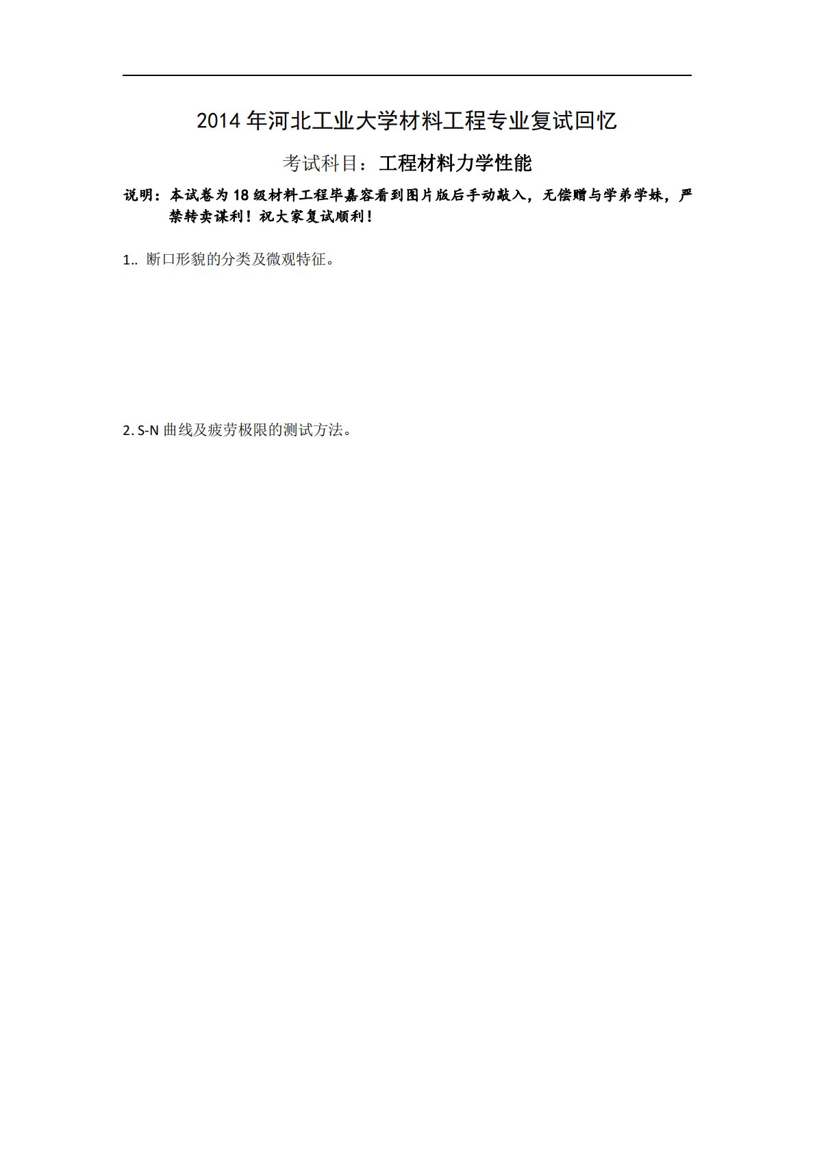 2014年河北工业大学材料工程专业复试回忆考试科目:工程材料力学性能说明:本试卷为18级材料工程毕嘉容看到图片版后手动敲入,无偿赠与学弟学妹,严禁转卖谋利!祝大家复试顺利!1..断口形貌的分类及微观特征。2.S-N曲线及疲劳极限的测试方法。2014年河北工业大学材料工程专业复试回忆考试科目:工程材料力学性能说明:本试卷为18级材料工程毕嘉容看到图片版后手动敲入,无偿赠与学弟学妹,严禁转卖谋利!祝大家复试顺利!1..断口形貌的分类及微观特征。2.S-N曲线及疲劳极限的测试方法。3.金属材料的耐磨性。4.简述合金元素对力学性能的影响。百校文库—海量高校资料共享库百校文库是一个线上大学生专业学习资料...