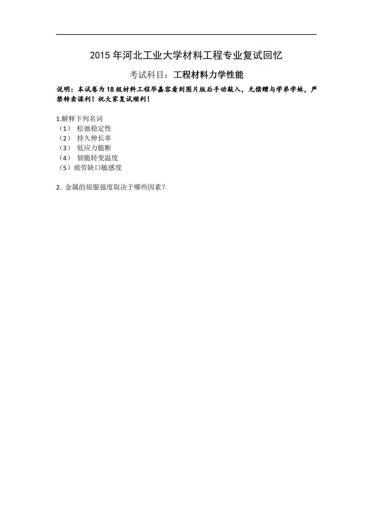 2015年河北工业大学材料工程专业复试回忆考试科目:工程材料力学性能说明:本试卷为18级材料工程毕嘉容看到图片版后手动敲入,无偿赠与学弟学妹,严禁转卖谋利!祝大家复试顺利!1.解释下列名词(1)松弛稳定性(2)持久伸长率(3)低应力脆断(4)韧脆转变温度(5)疲劳缺口敏感度2.金属的屈服强度取决于哪些因素?2015年河北工业大学材料工程专业复试回忆考试科目:工程材料力学性能说明:本试卷为18级材料工程毕嘉容看到图片版后手动敲入,无偿赠与学弟学妹,严禁转卖谋利!祝大家复试顺利!1.解释下列名词(1)松弛稳定性(2)持久伸长率(3)低应力脆断(4)韧脆转变温度(5)疲劳缺口敏感度2.金属的屈服强度...