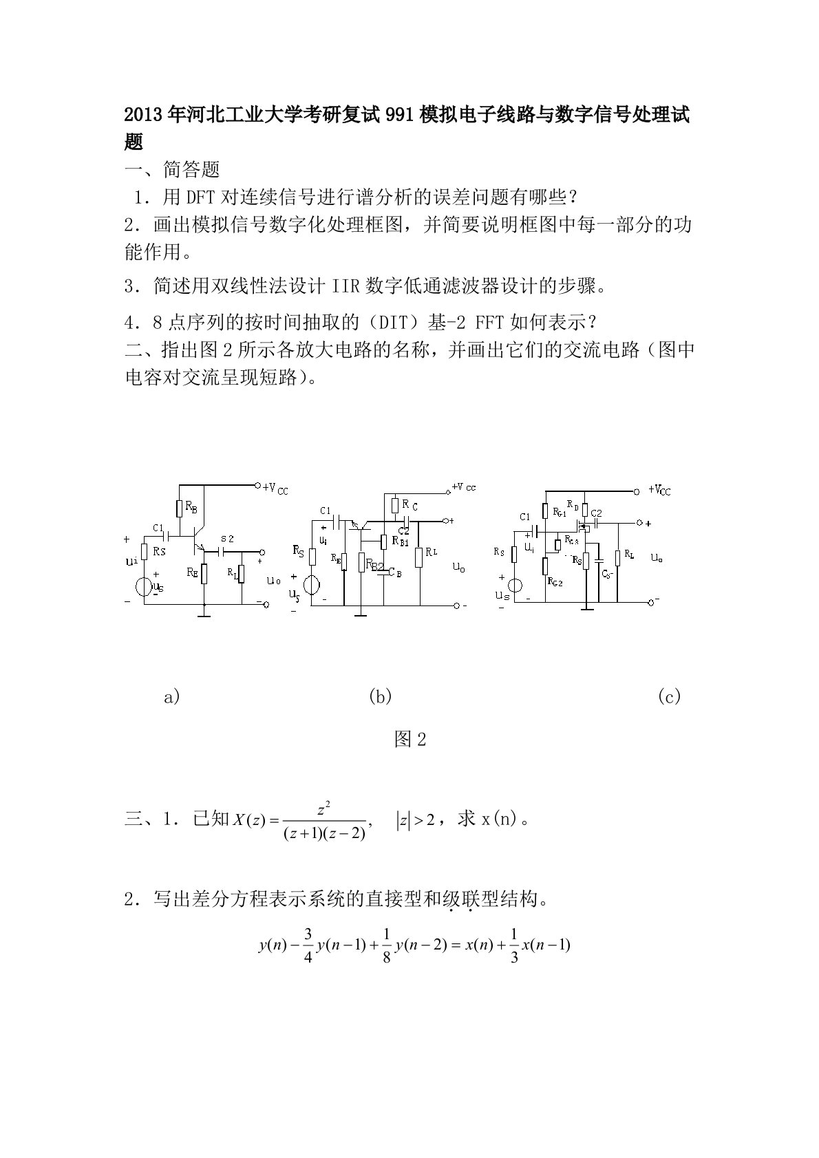 2013年河北工业大学考研复试991模拟电子线路与数字信号处理试题一、简答题1.用DFT对连续信号进行谱分析的误差问题有哪些?2.画出模拟信号数字化处理框图,并简要说明框图中每一部分的功能作用。3.简述用双线性法设计IIR数字低通滤波器设计的步骤。4.8点序列的按时间抽取的(DIT)基-2FFT如何表示?二、指出图2所示各放大电路的名称,并画出它们的交流电路(图中电容对交流呈现短路)。a)(b)(c)图2三、1.已知,求x(n)。2.写出差分方程表示系统的直接型和级联型结构。3.计算下面序列的N点DFT。(1)(2)四.设序列x(n)={1,3,2,1;n=0,1,2,3},另一序列h(n)=...