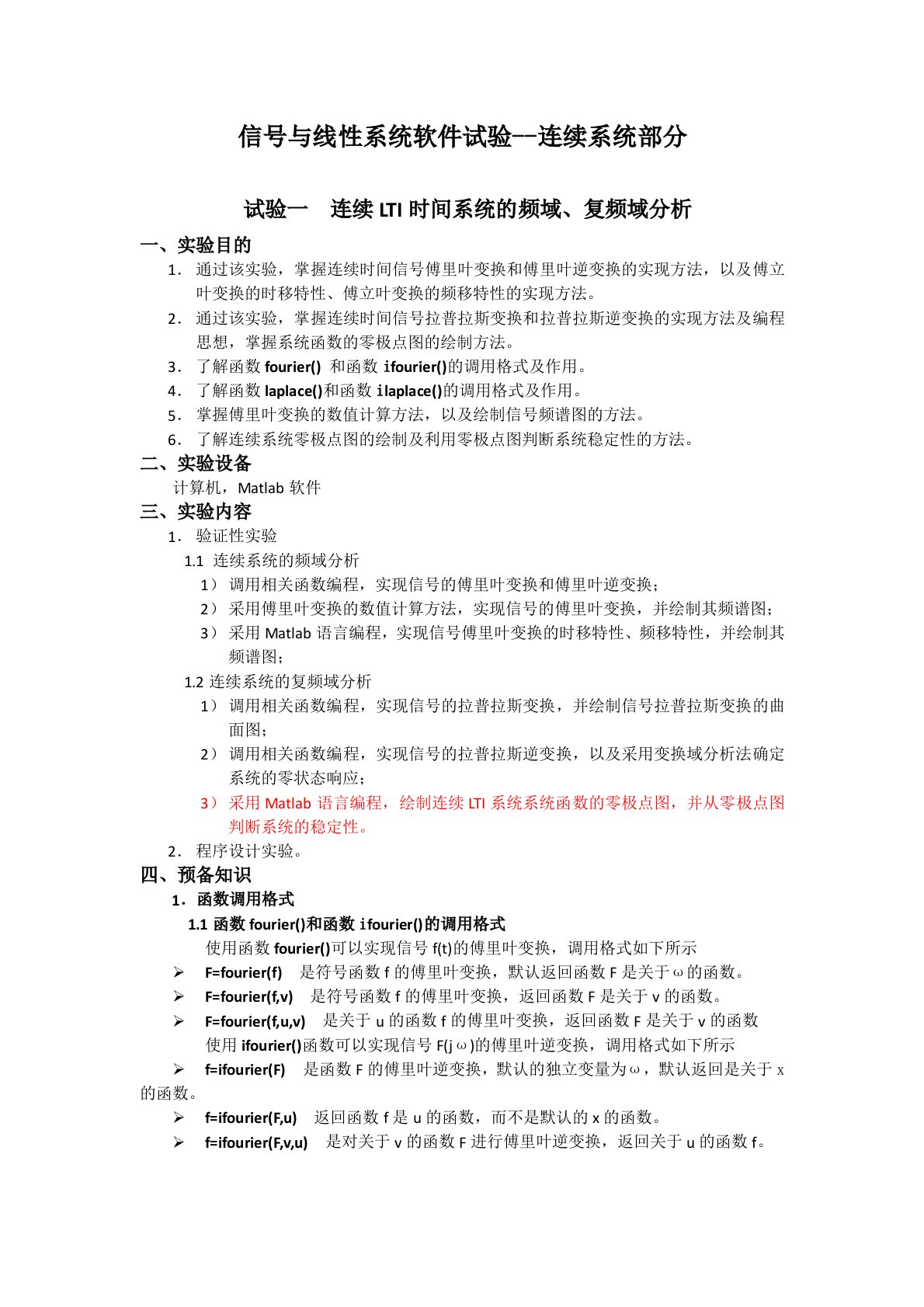 信号与线性系统软件试验--连续系统部分试验一连续LTI时间系统的频域、复频域分析一、实验目的通过该实验,掌握连续时间信号傅里叶变换和傅里叶逆变换的实现方法,以及傅立叶变换的时移特性、傅立叶变换的频移特性的实现方法。通过该实验,掌握连续时间信号拉普拉斯变换和拉普拉斯逆变换的实现方法及编程思想,掌握系统函数的零极点图的绘制方法。了解函数fourier()和函数ifourier()的调用格式及作用。了解函数laplace()和函数ilaplace()的调用格式及作用。掌握傅里叶变换的数值计算方法,以及绘制信号频谱图的方法。了解连续系统零极点图的绘制及利用零极点图判断系统稳定性的方法。二、实验设备计算...