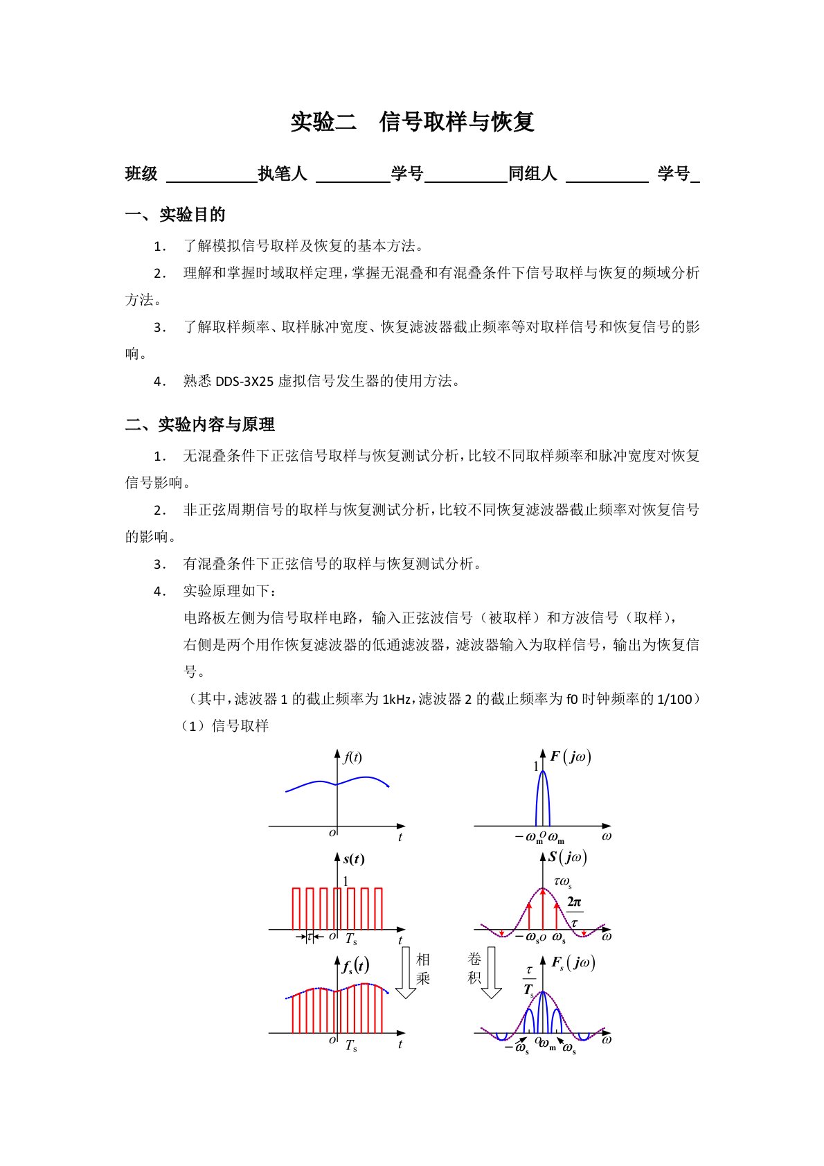 实验二信号取样与恢复班级执笔人学号同组人学号实验目的了解模拟信号取样及恢复的基本方法。理解和掌握时域取样定理,掌握无混叠和有混叠条件下信号取样与恢复的频域分析方法。了解取样频率、取样脉冲宽度、恢复滤波器截止频率等对取样信号和恢复信号的影响。熟悉DDS-3X25虚拟信号发生器的使用方法。无混叠条件下正弦信号取样与恢复测试分析,比较不同取样频率和脉冲宽度对恢复信号影响。非正弦周期信号的取样与恢复测试分析,比较不同恢复滤波器截止频率对恢复信号的影响。有混叠条件下正弦信号的取样与恢复测试分析。实验原理如下:电路板左侧为信号取样电路,输入正弦波信号(被取样)和方波信号(取样),右侧是两个用作恢复滤波器的...