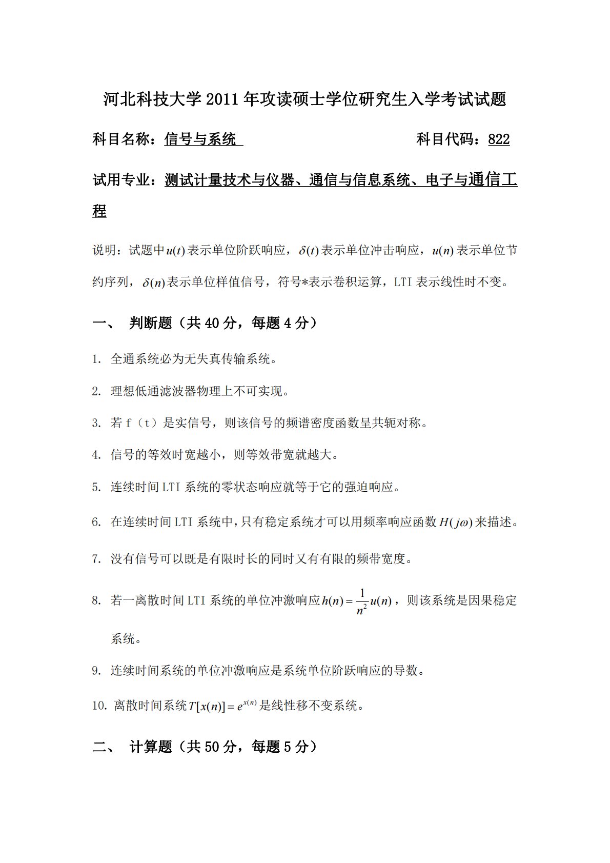 河北科技大学2011年攻读硕士学位研究生入学考试试题科目名称:信号与系统科目代码:822试用专业:测试计量技术与仪器、通信与信息系统、电子与通信工程说明:试题中()ut表示单位阶跃响应,()t表示单位冲击响应,()un表示单位节约序列,()n表示单位样值信号,符号*表示卷积运算,LTI表示线性时不变。一、判断题(共40分,每题4分)1.全通系统必为无失真传输系统。2.理想低通滤波器物理上不可实现。3.若f(t)是实信号,则该信号的频谱密度函数呈共轭对称。4.信号的等效时宽越小,则等效带宽就越大。5.连续时间LTI系统的零状态响应就等于它的强迫响应。6.在连续时间LTI系统中,只有稳定系统才...