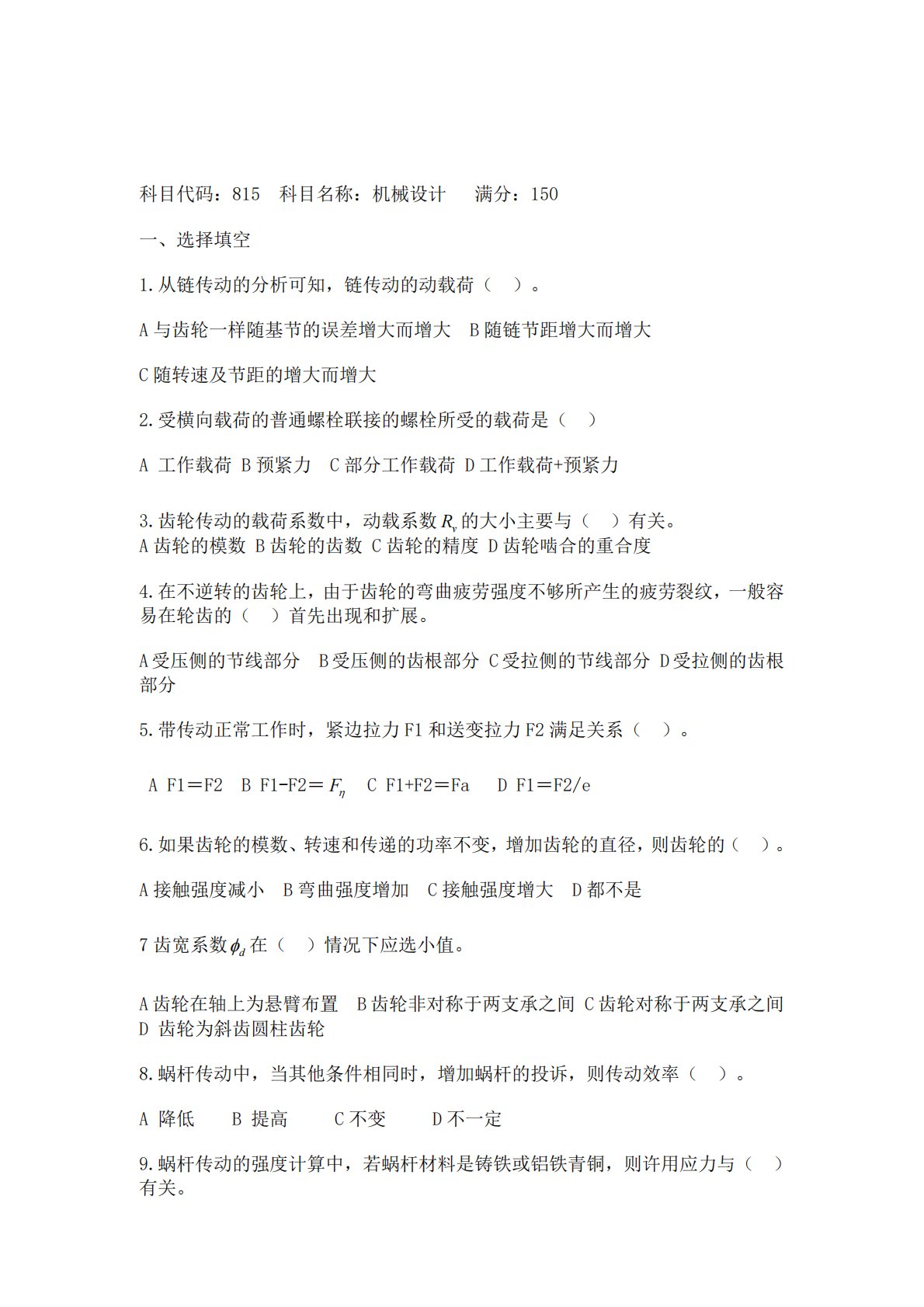 A齿轮的模数B齿轮的齿数C齿轮的精度D齿轮啮合的重合度4.在不逆转的齿轮上,由于齿轮的弯曲疲劳强度不够所产生的疲劳裂纹,一般容易在轮齿的()首先出现和扩展。A受压侧的节线部分B受压侧的齿根部分C受拉侧的节线部分D受拉侧的齿根部分 科目代码:815科目名称:机械设计满分:150一、选择填空1.从链传动的分析可知,链传动的动载荷()。A与齿轮一样随基节的误差增大而增大B随链节距增大而增大C随转速及节距的增大而增大2.受横向载荷的普通螺栓联接的螺栓所受的载荷是()A工作载荷B预紧力C部分工作载荷D工作载荷+预紧力3.齿轮传动的载荷系数中,动载系数的大小主要与()有关。5.带传动正常工作时,紧边拉力F...