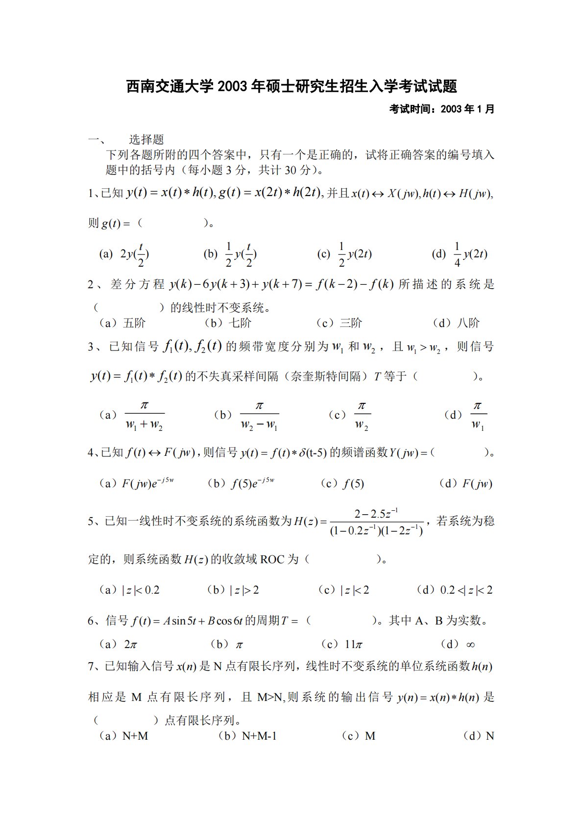 西南交通大学2003年硕士研究生招生入学考试试题考试时间:2003年1月一、选择题下列各题所附的四个答案中,只有一个是正确的,试将正确答案的编号填入题中的括号内(每小题3分,共计30分)。1、已知()()(),()(2)(2),ytxthtgtxtht并且()(),()(),xtXjwhtHjw则()gt()。(a)2()2ty(b)1()22ty(c)1(2)2yt(d)1(2)4yt2、差分方程()6(3)(7)(2)()ykykykfkfk所描述的系统是()的线性时不变系统。(a)五阶(b)七阶(c)三阶(d)八阶3、已知信号12(),()ftft的频带宽度分...