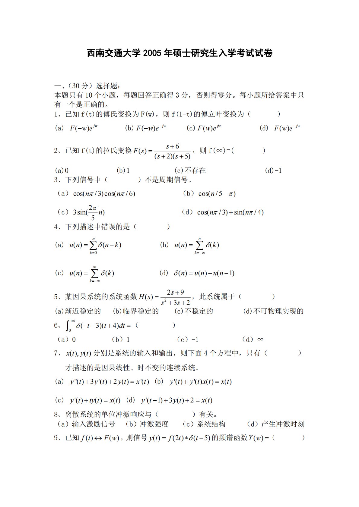 西南交通大学2005年硕士研究生入学考试试卷一、(30分)选择题:本题只有10个小题,每题回答正确得3分,否则得零分。每小题所给答案中只有一个是正确的。1、已知f(t)的傅氏变换为F(w),则f(1-t)的傅立叶变换为()(a)()jwFwe(b)()jwFwe(c)()jwFwe(d)()jwFwe2、已知f(t)的拉氏变换6()(2)(5)sFsss,则f(∞)=()(a)0(b)1(c)不存在(d)-13、下列信号中()不是周期信号。(a)cos(/3)cos(/6)nn(b)cos(/5)n(c)23sin()5n(d)cos(/3)sin(/4)nn4...