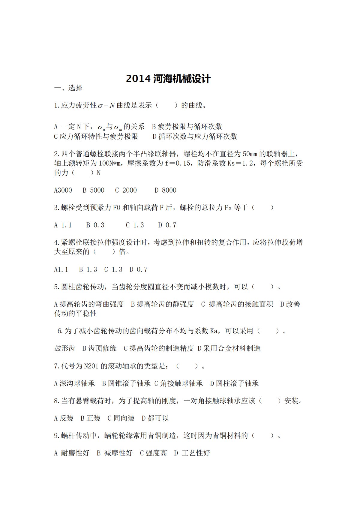 C应力循环特性与疲劳极限D循环次数与应力循环次数2.四个普通螺栓联接两个半凸缘联轴器,螺栓均不在直径为50mm的联轴器上,轴上额转矩为100N*m,摩擦系数为f=0.15,防滑系数Ks=1.2,每个螺栓所受的力()NA3000B5000C2000D80003.螺栓受到预紧力F0和轴向载荷F后,螺栓的总拉力Fx等于()A1.1B0.3C1.3D0.74.紧螺栓联接拉伸强度设计时,考虑到拉伸和扭转的复合作用,应将拉伸载荷增大至原来的()倍。A1.1B1.3C1.3D0.75.圆柱齿轮传动,当齿轮分度圆直径不变而减小模数时,可以()。A提高轮齿的弯曲强度B提高轮齿的静强度C提高轮齿的接触面积D改善...