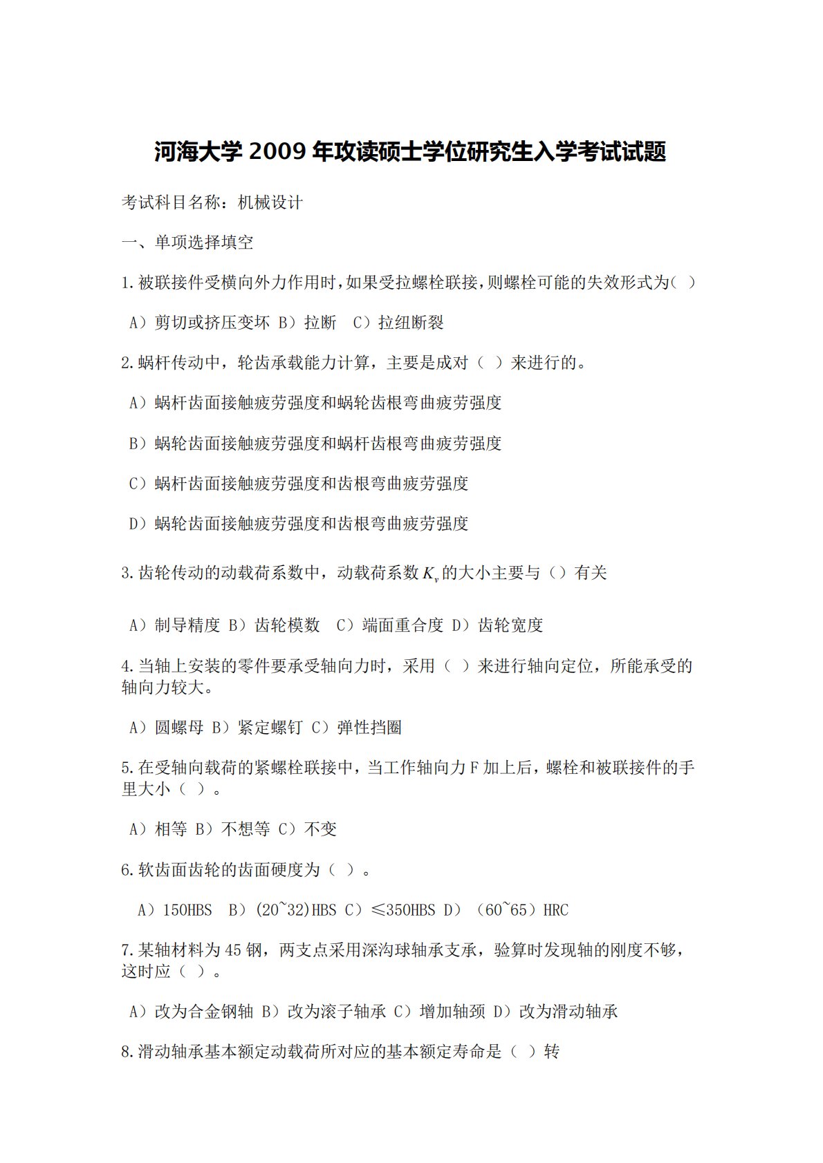 河海大学2009年攻读硕士学位研究生入学考试试题考试科目名称:机械设计一、单项选择填空1.被联接件受横向外力作用时,如果受拉螺栓联接,则螺栓可能的失效形式为()A)剪切或挤压变坏B)拉断C)拉纽断裂2.蜗杆传动中,轮齿承载能力计算,主要是成对()来进行的。A)蜗杆齿面接触疲劳强度和蜗轮齿根弯曲疲劳强度B)蜗轮齿面接触疲劳强度和蜗杆齿根弯曲疲劳强度C)蜗杆齿面接触疲劳强度和齿根弯曲疲劳强度D)蜗轮齿面接触疲劳强度和齿根弯曲疲劳强度3.齿轮传动的动载荷系数中,动载荷系数的大小主要与()有关A)制导精度B)齿轮模数C)端面重合度D)齿轮宽度4.当轴上安装的零件要承受轴向力时,采用()来进行轴向定位...