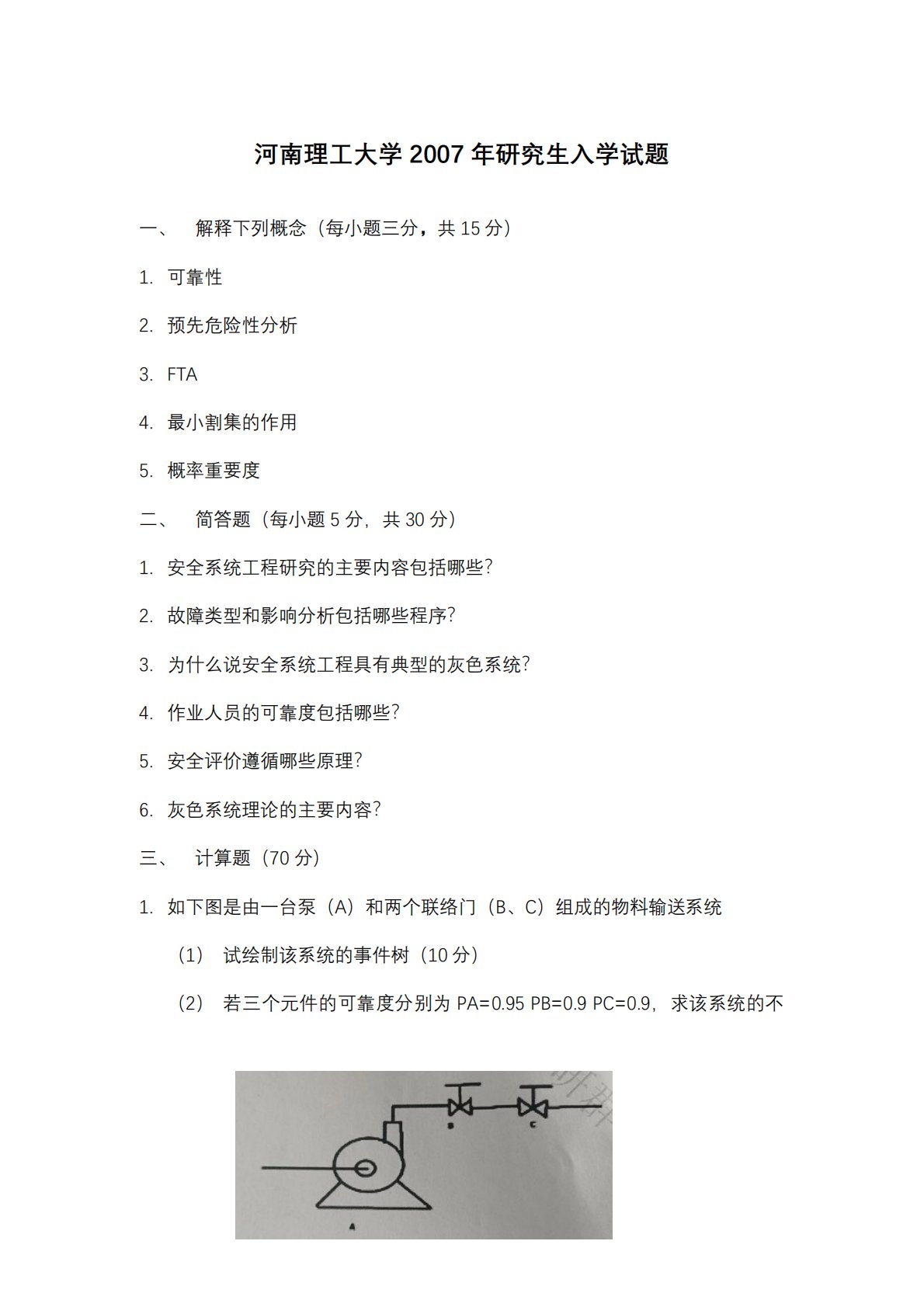 3/117河南理工大学2007年研究生入学试题一、解释下列概念(每小题三分,共15分)1.可靠性2.预先危险性分析3.FTA4.最小割集的作用5.概率重要度二、简答题(每小题5分,共30分)1.安全系统工程研究的主要内容包括哪些?2.故障类型和影响分析包括哪些程序?3.为什么说安全系统工程具有典型的灰色系统?4.作业人员的可靠度包括哪些?5.安全评价遵循哪些原理?6.灰色系统理论的主要内容?三、计算题(70分)1.如下图是由一台泵(A)和两个联络门(B、C)组成的物料输送系统(1)试绘制该系统的事件树(10分)(2)若三个元件的可靠度分别为PA=0.95PB=0.9PC=0.9,求该系统的不4...