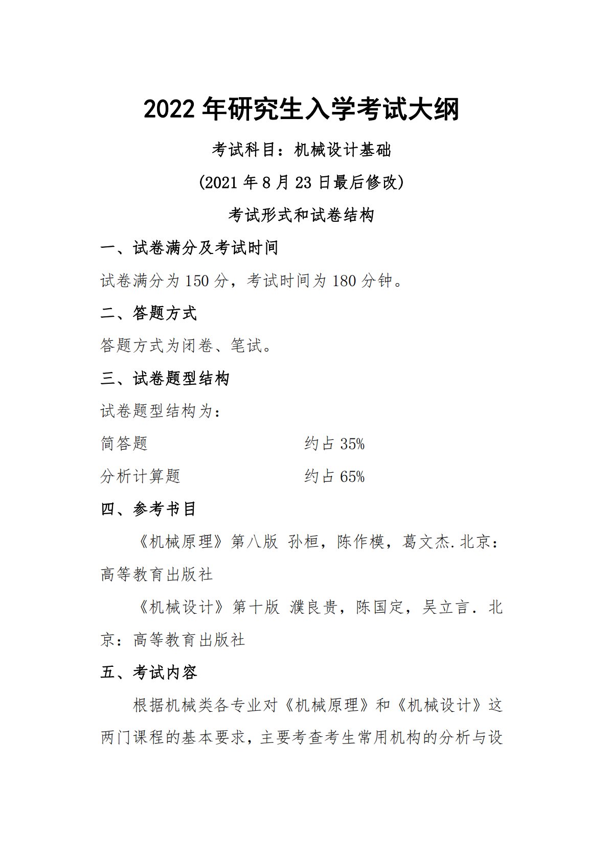 2022年研究生入学考试大纲考试科目:机械设计基础(2021年8月23日最后修改)考试形式和试卷结构一、试卷满分及考试时间试卷满分为150分,考试时间为180分钟。二、答题方式答题方式为闭卷、笔试。三、试卷题型结构试卷题型结构为:简答题约占35%分析计算题约占65%四、参考书目《机械原理》第八版孙桓,陈作模,葛文杰.北京:高等教育出版社《机械设计》第十版濮良贵,陈国定,吴立言.北京:高等教育出版社五、考试内容根据机械类各专业对《机械原理》和《机械设计》这两门课程的基本要求,主要考查考生常用机构的分析与设计,机械设计的基本知识,通用机械零件的设计原理与设计方法,对通用零件的选择运用,以及系统的结...