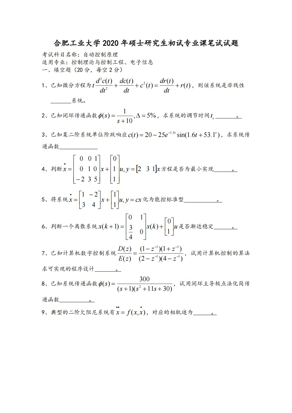 合肥工业大学2020年硕士研究生初试专业课笔试试题考试科目名称:自动控制原理适用专业:控制理论与控制工程、电子信息一、填空题(20分,每空2分)1、已知微分方程为)()()()()(222trdttdrtcdttdcdttcdt,则该系统是非线性系统。2、已知闭环传递函数%5,101)(ss,求系统的调节时间st。3、已知某二阶系统单位阶跃响应)1.536.1sin(2520)(5.1tetct,求系统传递函数4、判断xyuxx132,110532010100方程是否为最小实现。5、将系统cxyuxx...