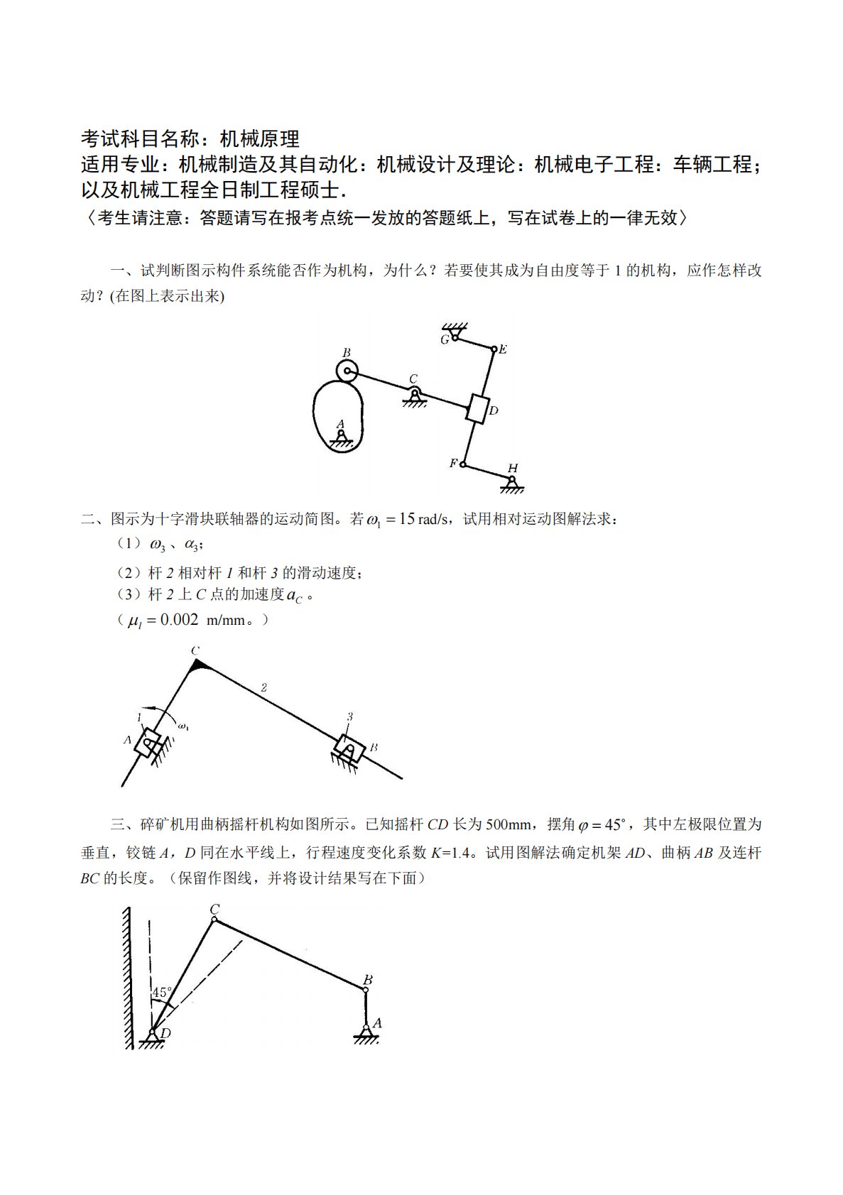 考试科目名称:机械原理适用专业:机械制造及其自动化:机械设计及理论:机械电子工程:车辆工程;以及机械工程全日制工程硕士.〈考生请注意:答题请写在报考点统一发放的答题纸上,写在试卷上的一律无效〉一、试判断图示构件系统能否作为机构,为什么?若要使其成为自由度等于1的机构,应作怎样改动?(在图上表示出来)二、图示为十字滑块联轴器的运动简图。若151rad/s,试用相对运动图解法求:(1)3、3;(2)杆2相对杆1和杆3的滑动速度;(3)杆2上C点的加速度Ca。(002.0lm/mm。)三、碎矿机用曲柄摇杆机构如图所示。已知摇杆CD长为500mm,摆角45,其中左极限位置为垂直,铰链...