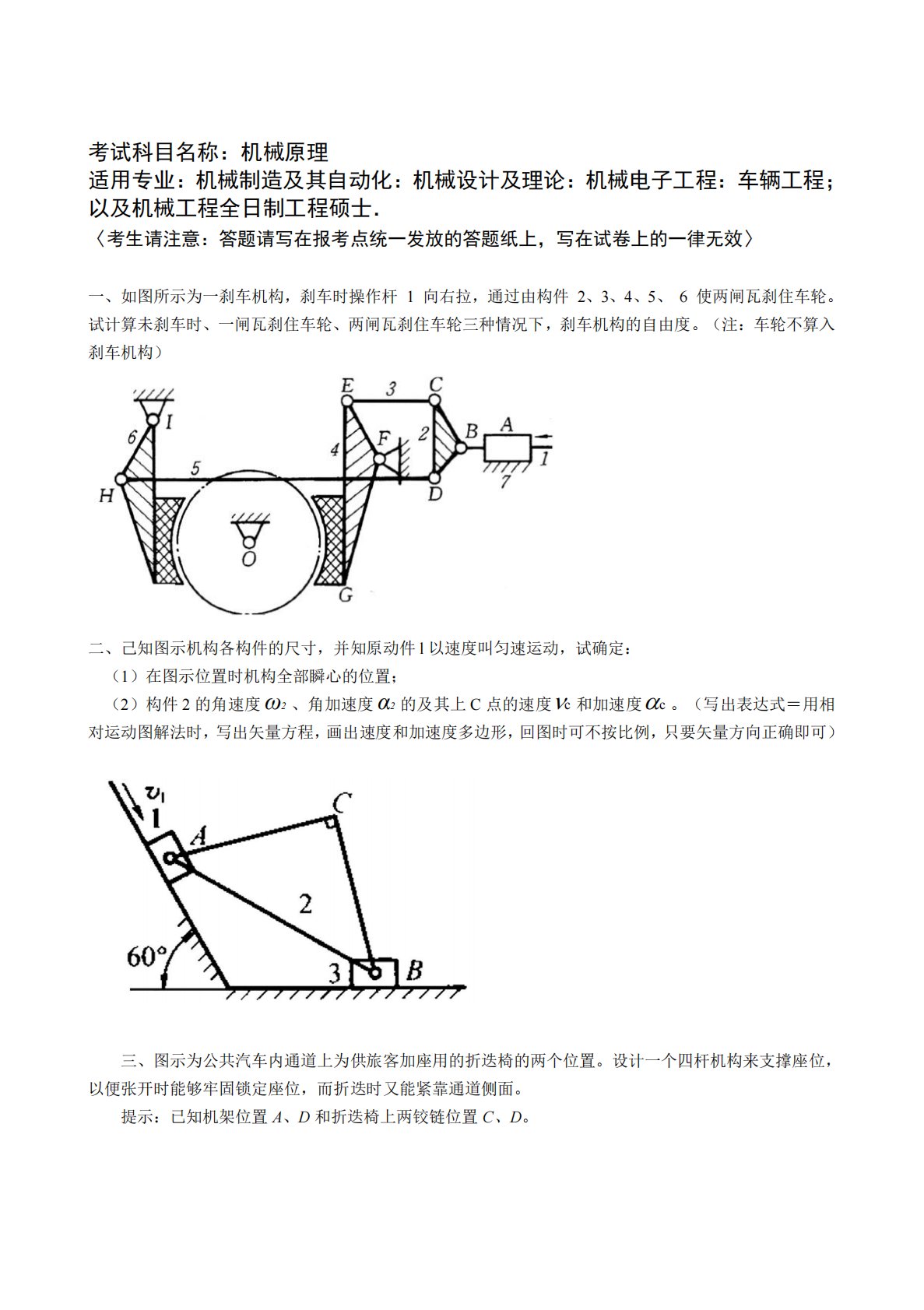 考试科目名称:机械原理适用专业:机械制造及其自动化:机械设计及理论:机械电子工程:车辆工程;以及机械工程全日制工程硕士.〈考生请注意:答题请写在报考点统一发放的答题纸上,写在试卷上的一律无效〉一、如图所示为一刹车机构,刹车时操作杆1向右拉,通过由构件2、3、4、5、6使两闸瓦刹住车轮。试计算未刹车时、一闸瓦刹住车轮、两闸瓦刹住车轮三种情况下,刹车机构的自由度。(注:车轮不算入刹车机构)二、己知图示机构各构件的尺寸,并知原动件l以速度叫匀速运动,试确定:(1)在图示位置时机构全部瞬心的位置;(2)构件2的角速度2ω、角加速度2α的及其上C点的速度c和加速度c。(写出表达式=用相对运动图解法时...
