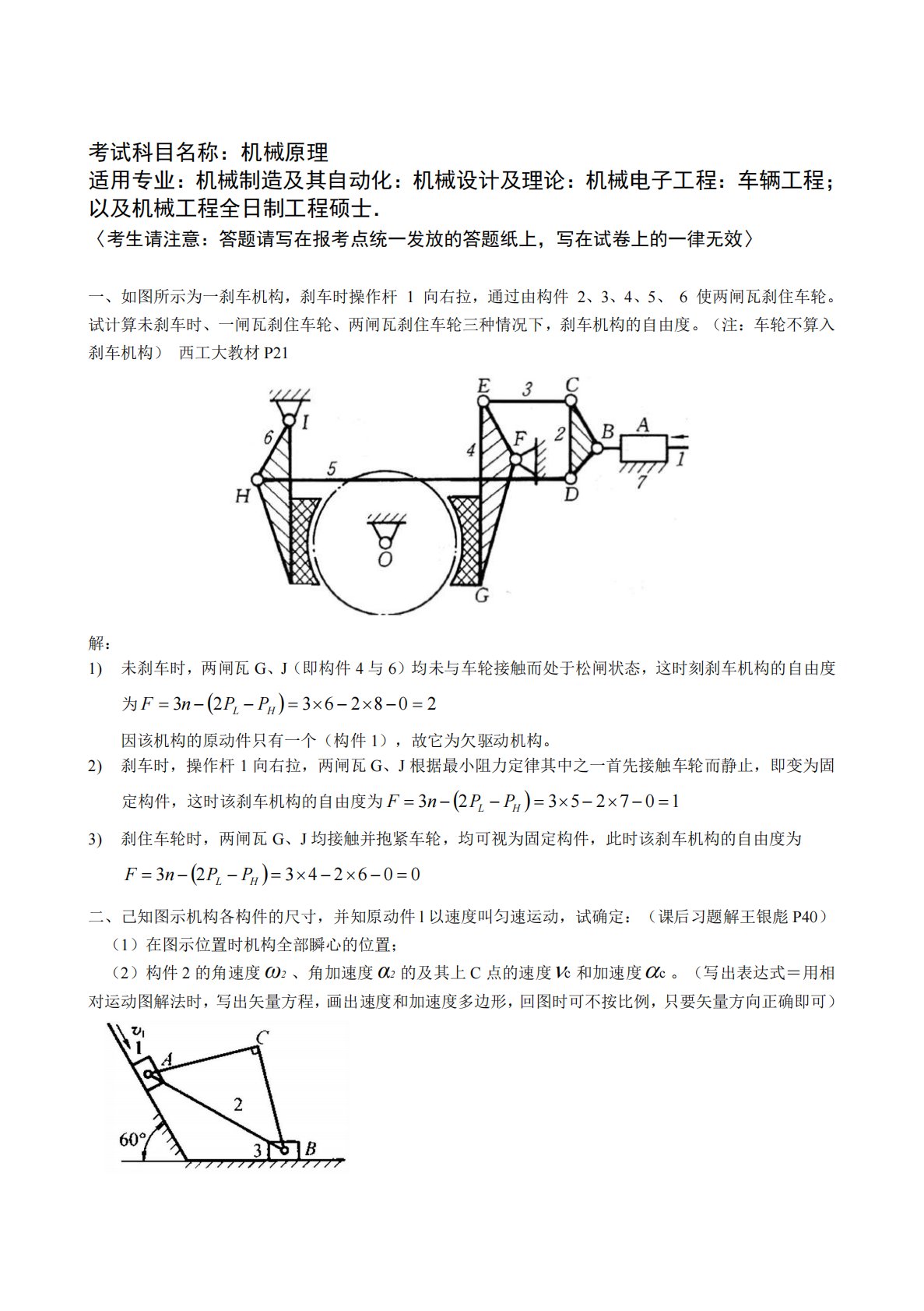 考试科目名称:机械原理适用专业:机械制造及其自动化:机械设计及理论:机械电子工程:车辆工程;以及机械工程全日制工程硕士.〈考生请注意:答题请写在报考点统一发放的答题纸上,写在试卷上的一律无效〉一、如图所示为一刹车机构,刹车时操作杆1向右拉,通过由构件2、3、4、5、6使两闸瓦刹住车轮。试计算未刹车时、一闸瓦刹住车轮、两闸瓦刹住车轮三种情况下,刹车机构的自由度。(注:车轮不算入刹车机构)西工大教材P21解:1)未刹车时,两闸瓦G、J(即构件4与6)均未与车轮接触而处于松闸状态,这时刻刹车机构的自由度为20826323HLPPnF因该机构的原动件只有一个(构件1),故它为欠驱...