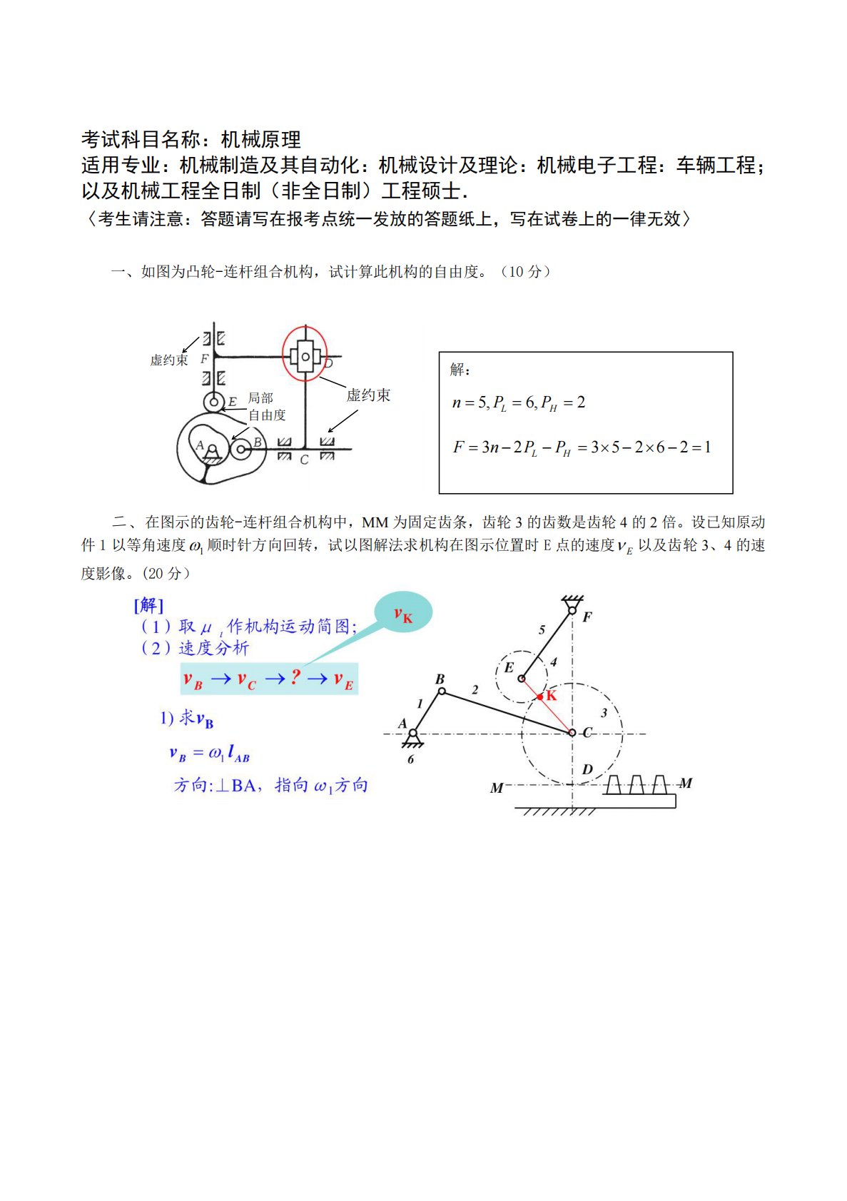 考试科目名称:机械原理适用专业:机械制造及其自动化:机械设计及理论:机械电子工程:车辆工程;以及机械工程全日制(非全日制)工程硕士.〈考生请注意:答题请写在报考点统一发放的答题纸上,写在试卷上的一律无效〉一、如图为凸轮-连杆组合机构,试计算此机构的自由度。(10分)虚约束局部自由度解:2,6,5HLPPn12625323HLPPnF虚约束二、在图示的齿轮-连杆组合机构中,MM为固定齿条,齿轮3的齿数是齿轮4的2倍。设已知原动件1以等角速度1顺时针方向回转,试以图解法求机构在图示位置时E点的速度E以及齿轮3、4的速度影像。(20分)三、如图所示,设计一铰链四杆机构,已...