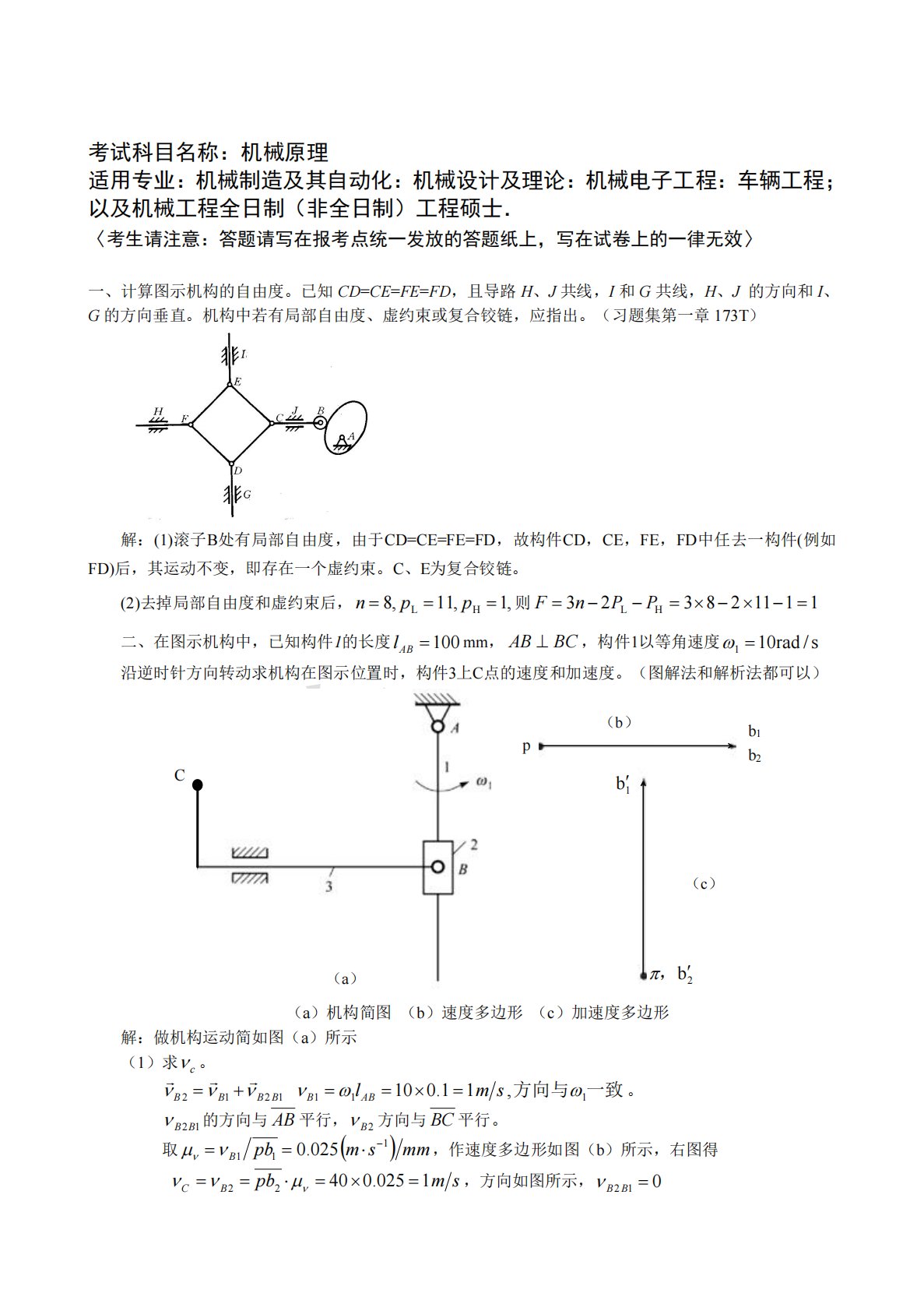 考试科目名称:机械原理适用专业:机械制造及其自动化:机械设计及理论:机械电子工程:车辆工程;以及机械工程全日制(非全日制)工程硕士.〈考生请注意:答题请写在报考点统一发放的答题纸上,写在试卷上的一律无效〉一、计算图示机构的自由度。已知CD=CE=FE=FD,且导路H、J共线,I和G共线,H、J的方向和I、G的方向垂直。机构中若有局部自由度、虚约束或复合铰链,应指出。(习题集第一章173T)解:(1)滚子B处有局部自由度,由于CD=CE=FE=FD,故构件CD,CE,FE,FD中任去一构件(例如FD)后,其运动不变,即存在一个虚约束。C、E为复合铰链。(2)去掉局部自由度和虚约束后,,1,11,...