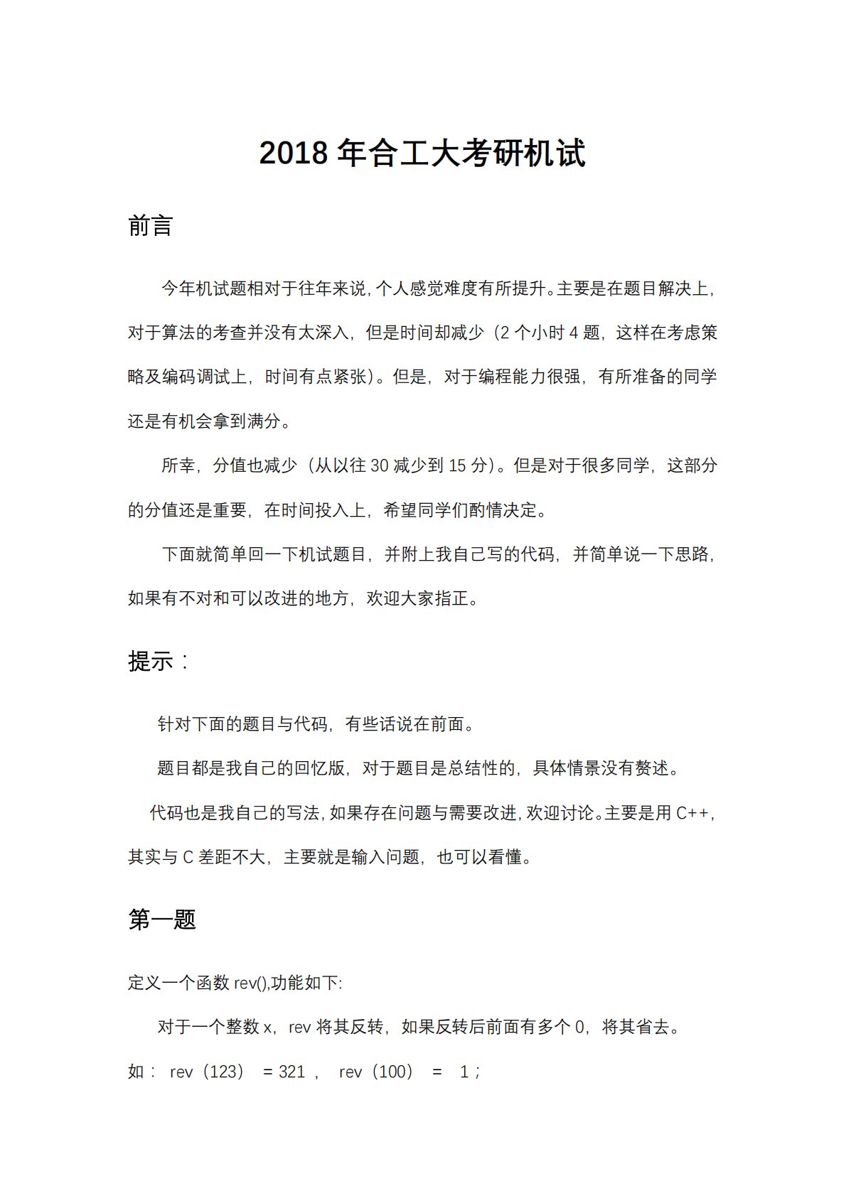 2018年合工大考研机试前言今年机试题相对于往年来说,个人感觉难度有所提升。主要是在题目解决上,对于算法的考查并没有太深入,但是时间却减少(2个小时4题,这样在考虑策略及编码调试上,时间有点紧张)。但是,对于编程能力很强,有所准备的同学还是有机会拿到满分。所幸,分值也减少(从以往30减少到15分)。但是对于很多同学,这部分的分值还是重要,在时间投入上,希望同学们酌情决定。下面就简单回一下机试题目,并附上我自己写的代码,并简单说一下思路,如果有不对和可以改进的地方,欢迎大家指正。提示:针对下面的题目与代码,有些话说在前面。题目都是我自己的回忆版,对于题目是总结性的,具体情景没有赘述。代码也是我自...