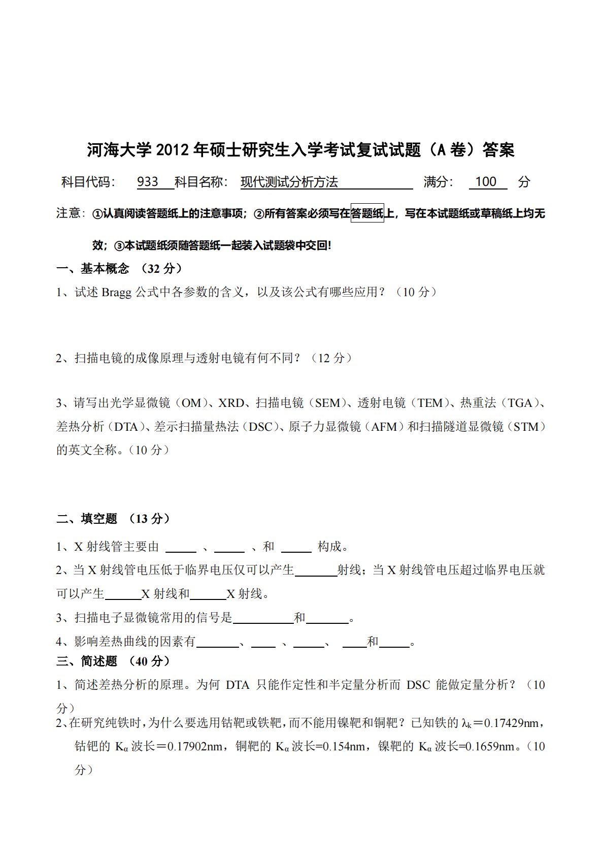 河海大学2012年硕士研究生入学考试复试试题(A卷)答案满分:100分科目代码:933科目名称:现代测试分析方法注意:①认真阅读答题纸上的注意事项;②所有答案必须写在答题纸上,写在本试题纸或草稿纸上均无效;③本试题纸须随答题纸一起装入试题袋中交回!一、基本概念(32分)1、试述Bragg公式中各参数的含义,以及该公式有哪些应用?(10分)2、扫描电镜的成像原理与透射电镜有何不同?(12分)3、请写出光学显微镜(OM)、XRD、扫描电镜(SEM)、透射电镜(TEM)、热重法(TGA)、差热分析(DTA)、差示扫描量热法(DSC)、原子力显微镜(AFM)和扫描隧道显微镜(STM)的英文全称。(10...