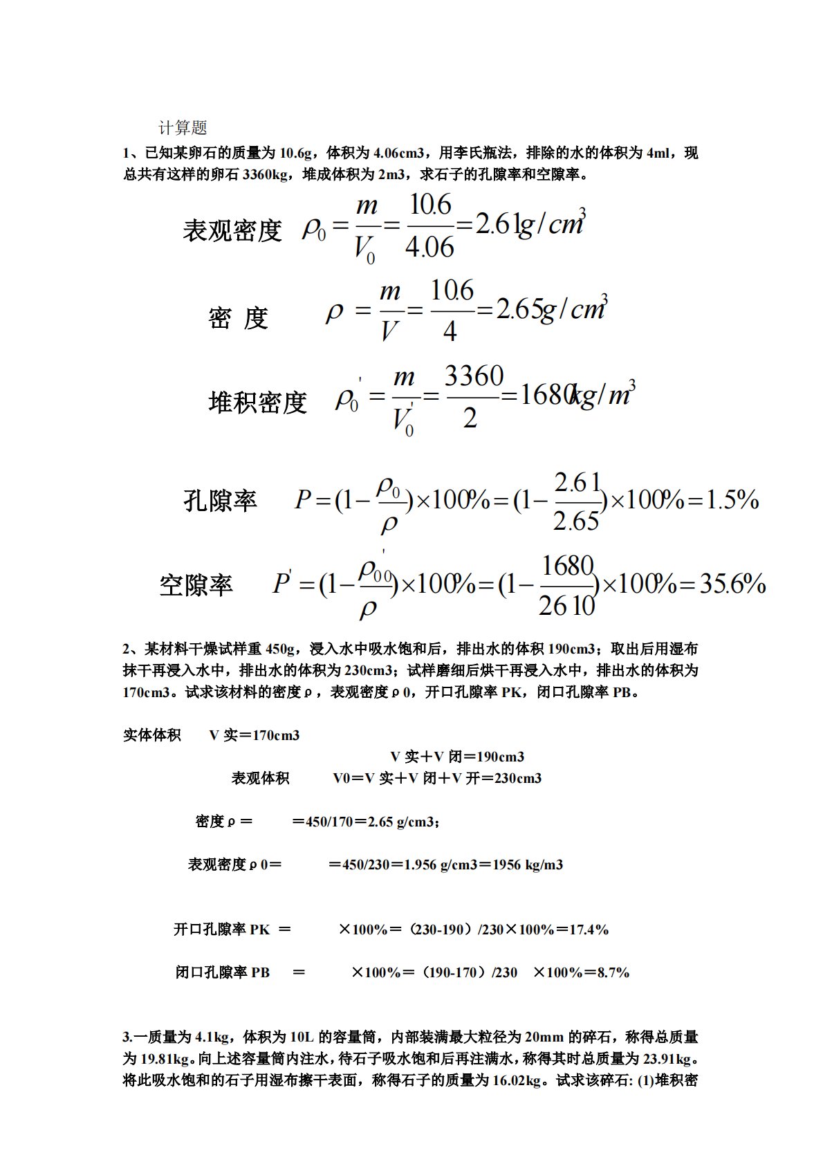 1、已知某卵石的质量为10.6g,体积为4.06cm3,用李氏瓶法,排除的水的体积为4ml,现总共有这样的卵石3360kg,堆成体积为2m3,求石子的孔隙率和空隙率。2、某材料干燥试样重450g,浸入水中吸水饱和后,排出水的体积190cm3;取出后用湿布抹干再浸入水中,排出水的体积为230cm3;试样磨细后烘干再浸入水中,排出水的体积为170cm3。试求该材料的密度ρ,表观密度ρ0,开口孔隙率PK,闭口孔隙率PB。实体体积V实=170cm3表观体积V实+V闭=190cm3V0=V实+V闭+V开=230cm3密度ρ==450/170=2.65g/cm3;表观密度ρ0==450/230=1.956...