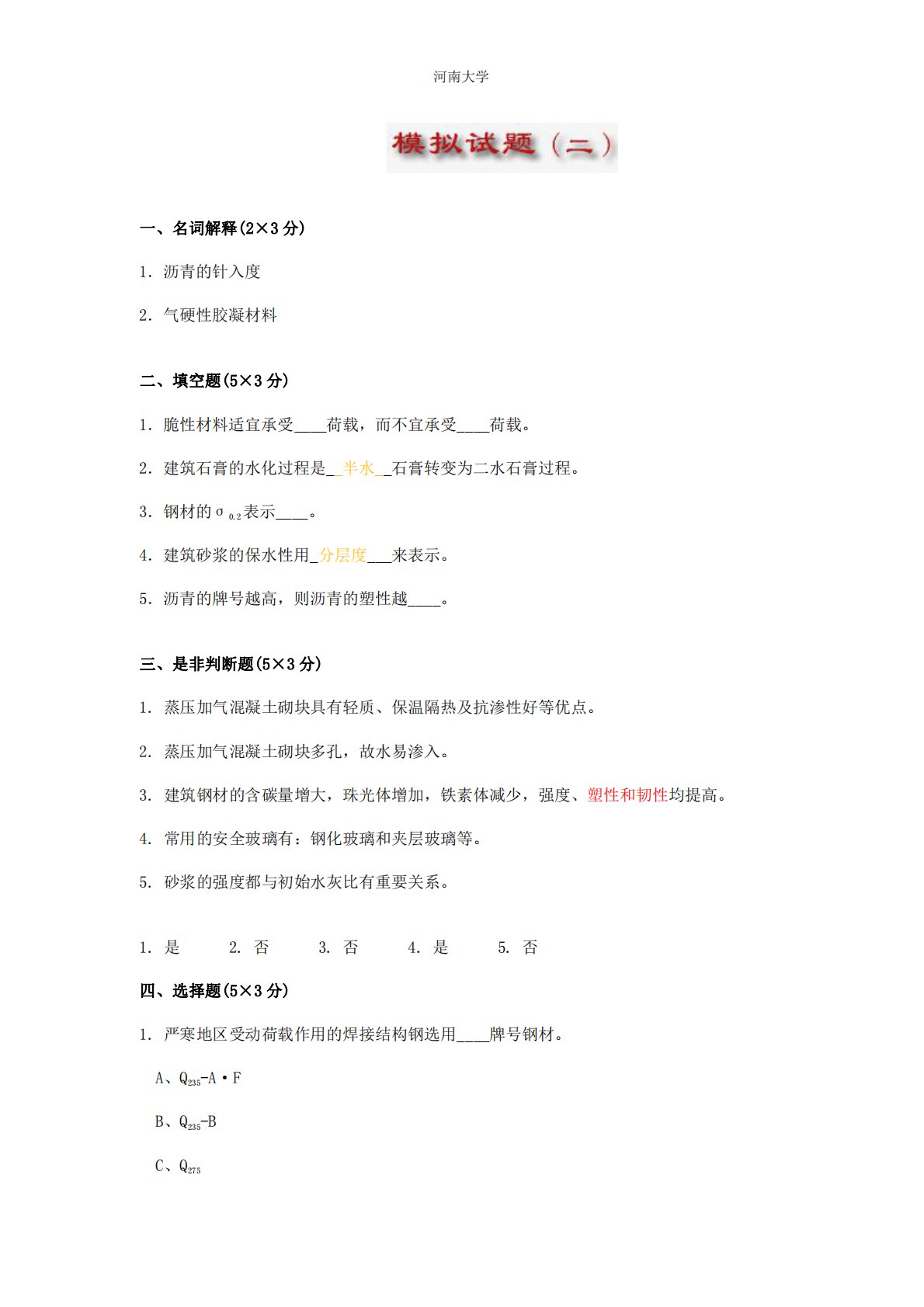 河南大学一、名词解释(2×3分)1.沥青的针入度2.气硬性胶凝材料二、填空题(5×3分)1.脆性材料适宜承受____荷载,而不宜承受____荷载。2.建筑石膏的水化过程是__半水__石膏转变为二水石膏过程。3.钢材的σ0.2表示____。4.建筑砂浆的保水性用_分层度___来表示。5.沥青的牌号越高,则沥青的塑性越____。三、是非判断题(5×3分)1.蒸压加气混凝土砌块具有轻质、保温隔热及抗渗性好等优点。2.蒸压加气混凝土砌块多孔,故水易渗入。3.建筑钢材的含碳量增大,珠光体增加,铁素体减少,强度、塑性和韧性均提高。4.常用的安全玻璃有:钢化玻璃和夹层玻璃等。5.砂浆的强度都与初始水灰比有重...
