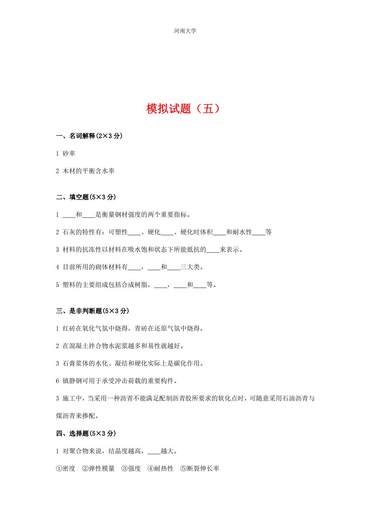 河南大学模拟试题(五)一、名词解释(2×3分)1砂率2木材的平衡含水率二、填空题(5×3分)1__和__是衡量钢材强度的两个重要指标。2石灰的特性有:可塑性__、硬化__、硬化时体积__和耐水性__等3材料的抗冻性以材料在吸水饱和状态下所能抵抗的__来表示。4目前所用的砌体材料有__,__和__三大类。5塑料的主要组成包括合成树脂,__,__和__等。三、是非判断题(5×3分)1红砖在氧化气氛中烧得,青砖在还原气氛中烧得。2在混凝土拌合物水泥浆越多和易性就越好。3石膏浆体的水化、凝结和硬化实际上是碳化作用。6镇静钢可用于承受冲击荷载的重要构件。3施工中,当采用一种沥青不能满足配制沥青胶所要求的...