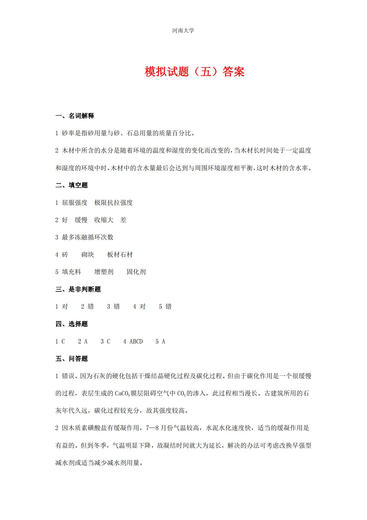河南大学一、名词解释1砂率是指砂用量与砂、石总用量的质量百分比。2木材中所含的水分是随着环境的温度和湿度的变化而改变的,当木材长时间处于一定温度和湿度的环境中时,木材中的含水量最后会达到与周围环境湿度相平衡,这时木材的含水率。二、填空模拟试题(五)´ð°¸题1屈服强度极限抗拉强度2好缓慢收缩大差3最多冻融循环次数4砖砌块板材石材5填充料增塑剂固化剂三、是非判断题1对2错3错4对5错四、选择题1C2A3C4ABCD5A五、问答题1错误。因为石灰的硬化包括干燥结晶硬化过程及碳化过程。但由于碳化作用是一个很缓慢的过程,表层生成的CaCO3膜层阻碍空气中CO2的渗入,此过程相当漫长。古建筑所用的石灰年...