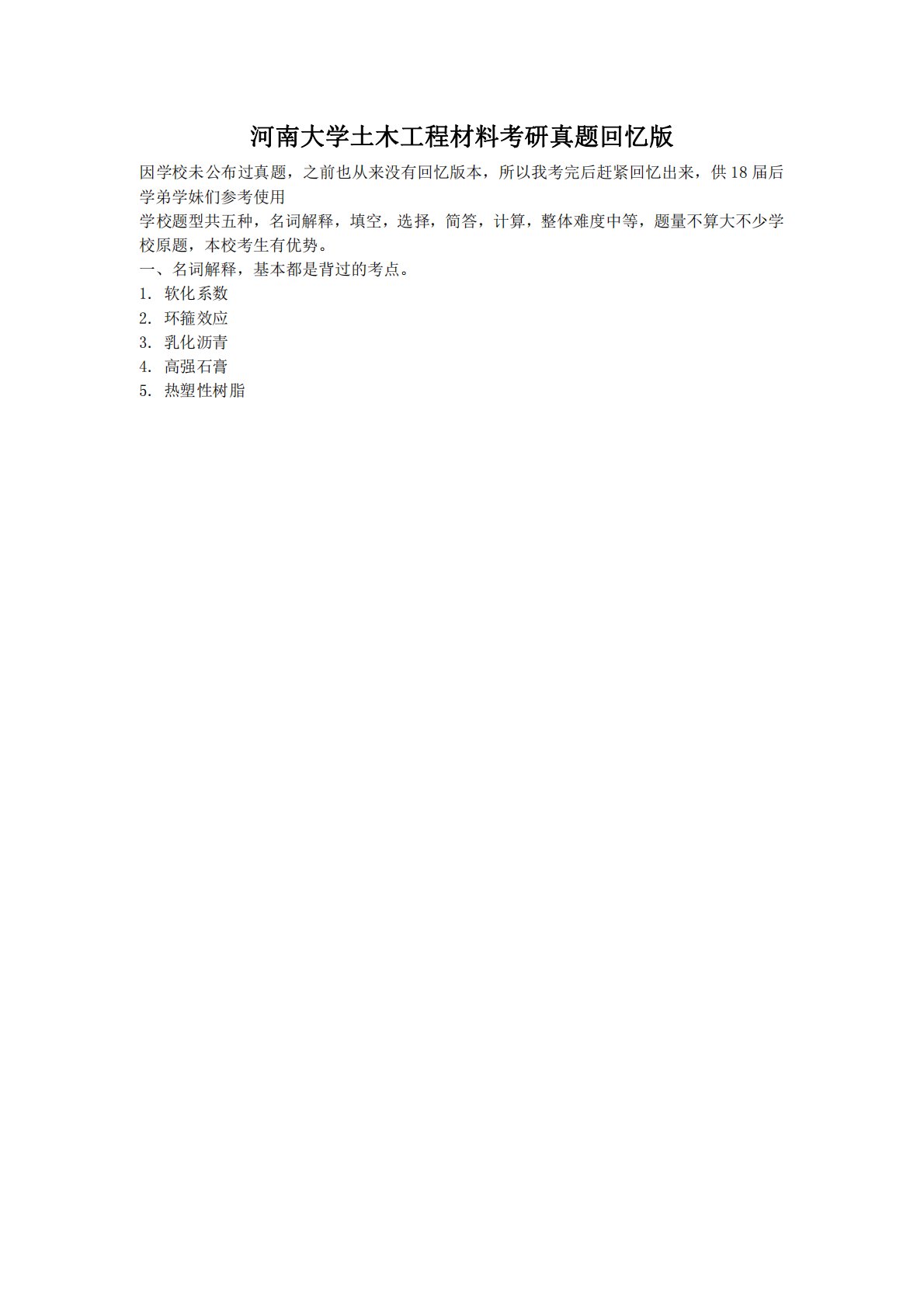 河南大学土木工程材料考研真题回忆版因学校未公布过真题,之前也从来没有回忆版本,所以我考完后赶紧回忆出来,供18届后学弟学妹们参考使用学校题型共五种,名词解释,填空,选择,简答,计算,整体难度中等,题量不算大不少学校原题,本校考生有优势。一、名词解释,基本都是背过的考点。1.软化系数2.环箍效应3.乳化沥青4.高强石膏5.热塑性树脂河南大学土木工程材料考研真题回忆版因学校未公布过真题,之前也从来没有回忆版本,所以我考完后赶紧回忆出来,供18届后学弟学妹们参考使用学校题型共五种,名词解释,填空,选择,简答,计算,整体难度中等,题量不算大不少学校原题,本校考生有优势。一、名词解释,基本都是背过的考点...