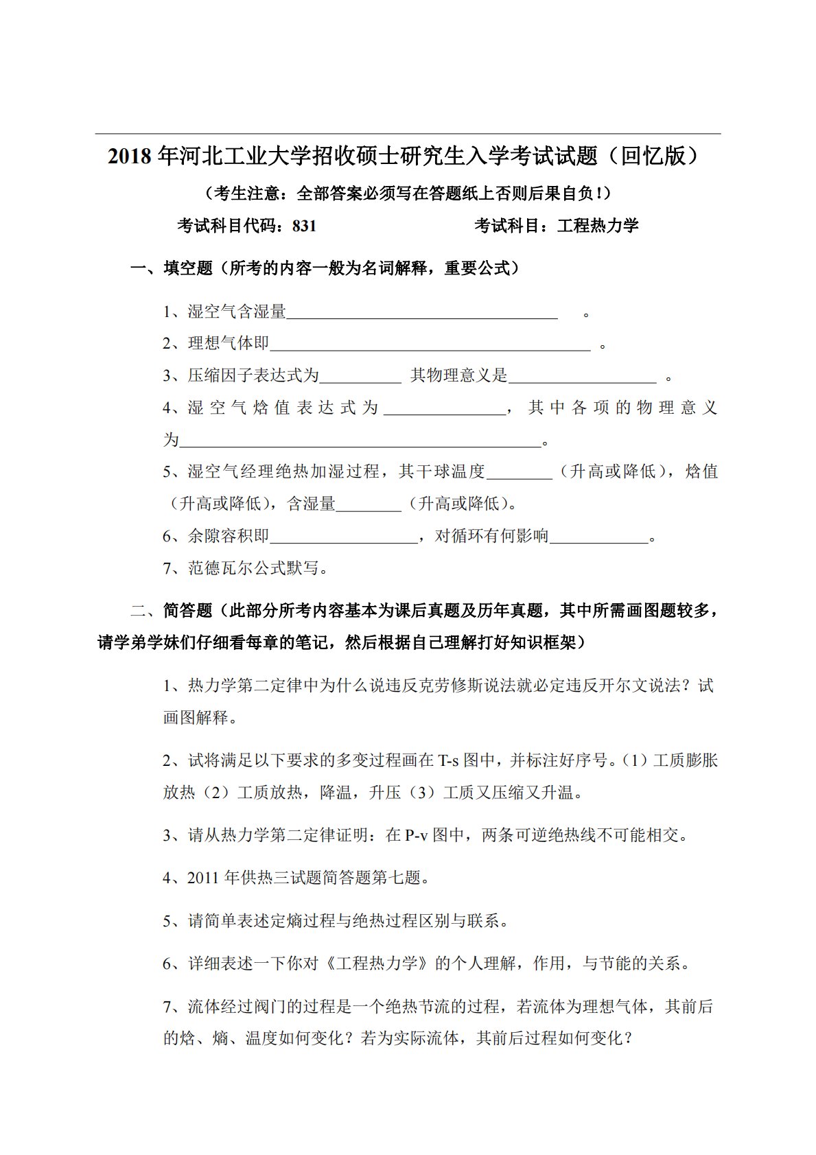 2018年河北工业大学招收硕士研究生入学考试试题(回忆版)(考生注意:全部答案必须写在答题纸上否则后果自负!)考试科目代码:831考试科目:工程热力学一、填空题(所考的内容一般为名词解释,重要公式)1、湿空气含湿量。2、理想气体即。3、压缩因子表达式为其物理意义是。4、湿空气焓值表达式为,其中各项的物理意义为。5、湿空气经理绝热加湿过程,其干球温度(升高或降低),焓值(升高或降低),含湿量(升高或降低)。6、余隙容积即,对循环有何影响。7、范德瓦尔公式默写。二、简答题(此部分所考内容基本为课后真题及历年真题,其中所需画图题较多,请学弟学妹们仔细看每章的笔记,然后根据自己理解打好知识框架)1、热...
