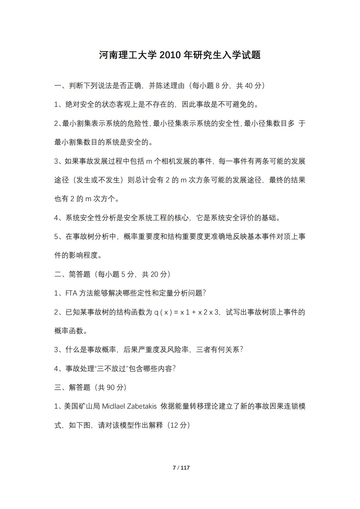 7/117河南理工大学2010年研究生入学试题一、判断下列说法是否正确,并陈述理由(每小题8分,共40分)1、绝对安全的状态客观上是不存在的,因此事故是不可避免的。2、最小割集表示系统的危险性,最小径集表示系统的安全性,最小径集数目多于最小割集数目的系统是安全的。3、如果事故发展过程中包括m个相机发展的事件,每一事件有两条可能的发展途径(发生或不发生)则总计会有2的m次方条可能的发展途径,最终的结果也有2的m次方个。4、系统安全性分析是安全系统工程的核心,它是系统安全评价的基础。5、在事故树分析中,概率重要度和结构重要度更准确地反映基本事件对顶上事件的影响程度。二、简答题(每小题5分,共20分...