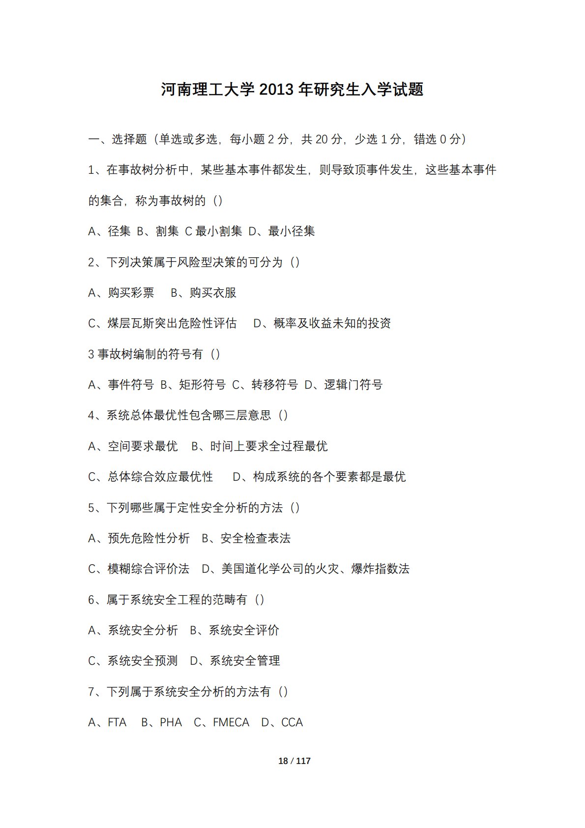 18/117河南理工大学2013年研究生入学试题一、选择题(单选或多选,每小题2分,共20分,少选1分,错选0分)1、在事故树分析中,某些基本事件都发生,则导致顶事件发生,这些基本事件的集合,称为事故树的()A、径集B、割集C最小割集D、最小径集2、下列决策属于风险型决策的可分为()A、购买彩票B、购买衣服C、煤层瓦斯突出危险性评估D、概率及收益未知的投资3事故树编制的符号有()A、事件符号B、矩形符号C、转移符号D、逻辑门符号4、系统总体最优性包含哪三层意思()A、空间要求最优B、时间上要求全过程最优C、总体综合效应最优性D、构成系统的各个要素都是最优5、下列哪些属于定性安全分析的方法()A...