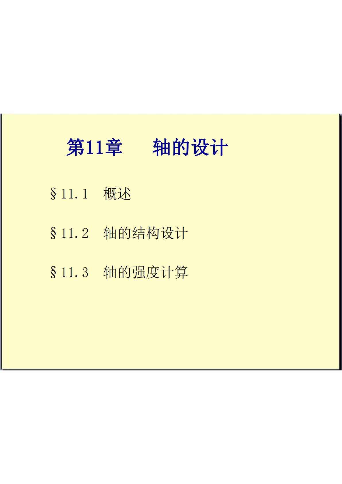 §11.1概述§11.2轴的结构设计§11.3轴的强度计算第11章轴的设计11.1概述轴的主要功用是支承回转零件及传递运动和动力。按照承受载荷的不同,轴可分为:除了刚性轴外,还有钢丝软轴(挠性轴),可以把回转运动灵活地传到不开敞地空间位置。Ø转 轴─同时承受弯矩和扭矩的轴,如减速器的轴。Ø心 轴─只承受弯矩的轴,如火车车轮轴。Ø传动轴─只承受扭矩的轴,如汽车的传动轴。直轴根据外形的不同,可分为光轴和阶梯轴。按照轴线形状的不同,轴可分为曲轴和直轴两大类。轴一般是实心轴,有特殊要求时也可制成空心轴,如航空发动机的主轴。11.1.1轴的分类转轴传动轴固定心轴前轮轮毂固定心轴前叉自行车前轮轴火车轮轴车...