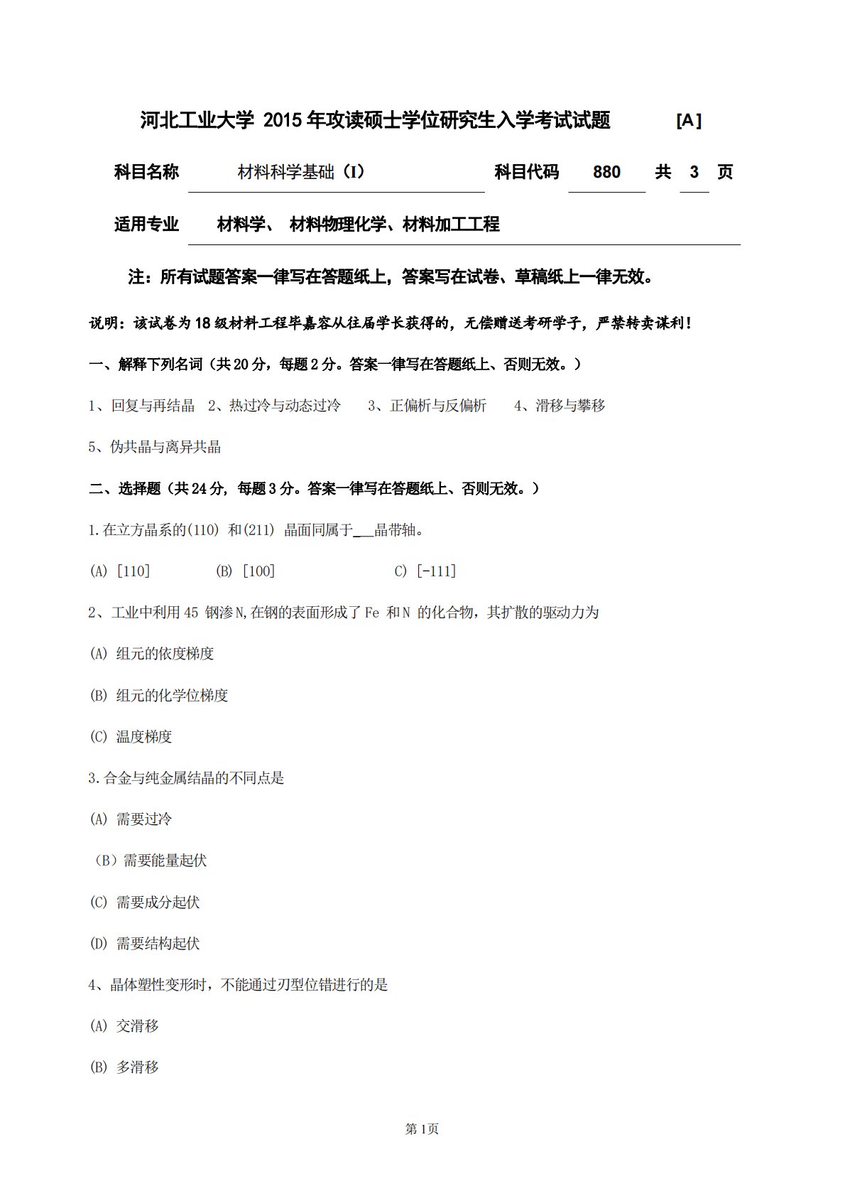 第1页河北工业大学2015年攻读硕士学位研究生入学考试试题[A]科目名称材料科学基础(І)科目代码880共3页适用专业材料学、材料物理化学、材料加工工程注:所有试题答案一律写在答题纸上,答案写在试卷、草稿纸上一律无效。说明:该试卷为18级材料工程毕嘉容从往届学长获得的,无偿赠送考研学子,严禁转卖谋利!一、解释下列名词(共20分,每题2分。答案一律写在答题纸上、否则无效。)1、回复与再结晶2、热过冷与动态过冷3、正偏析与反偏析4、滑移与攀移5、伪共晶与离异共晶二、选择题(共24分,每题3分。答案一律写在答题纸上、否则无效。)1.在立方晶系的(110)和(211)晶面同属于_晶带轴。(A)[110...