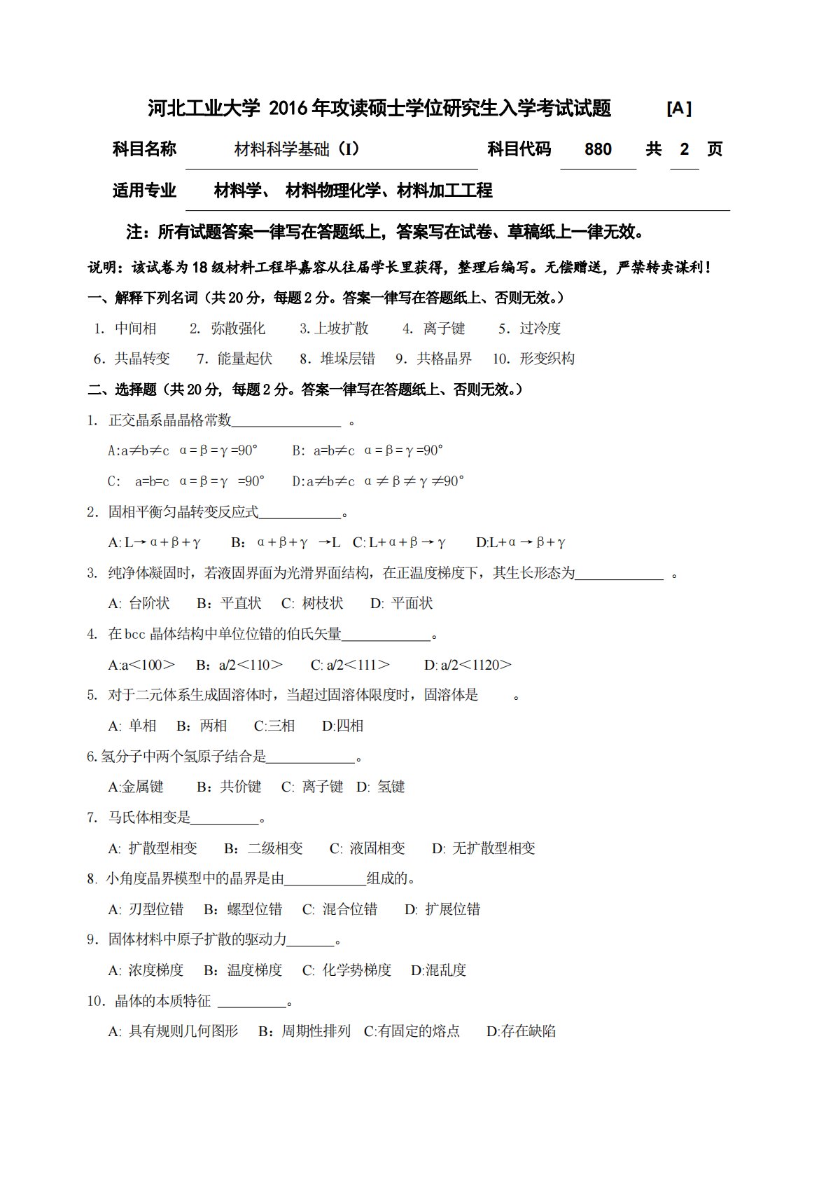 河北工业大学2016年攻读硕士学位研究生入学考试试题[A]科目名称材料科学基础(І)科目代码880共2页适用专业材料学、材料物理化学、材料加工工程注:所有试题答案一律写在答题纸上,答案写在试卷、草稿纸上一律无效。说明:该试卷为18级材料工程毕嘉容从往届学长里获得,整理后编写。无偿赠送,严禁转卖谋利!一、解释下列名词(共20分,每题2分。答案一律写在答题纸上、否则无效。)1.中间相2.弥散强化3.上坡扩散4.离子键5.过冷度6.共晶转变7.能量起伏8.堆垛层错9.共格晶界10.形变织构二、选择题(共20分,每题2分。答案一律写在答题纸上、否则无效。)1.正交晶系晶晶格常数。A:a≠b≠cα=β=...