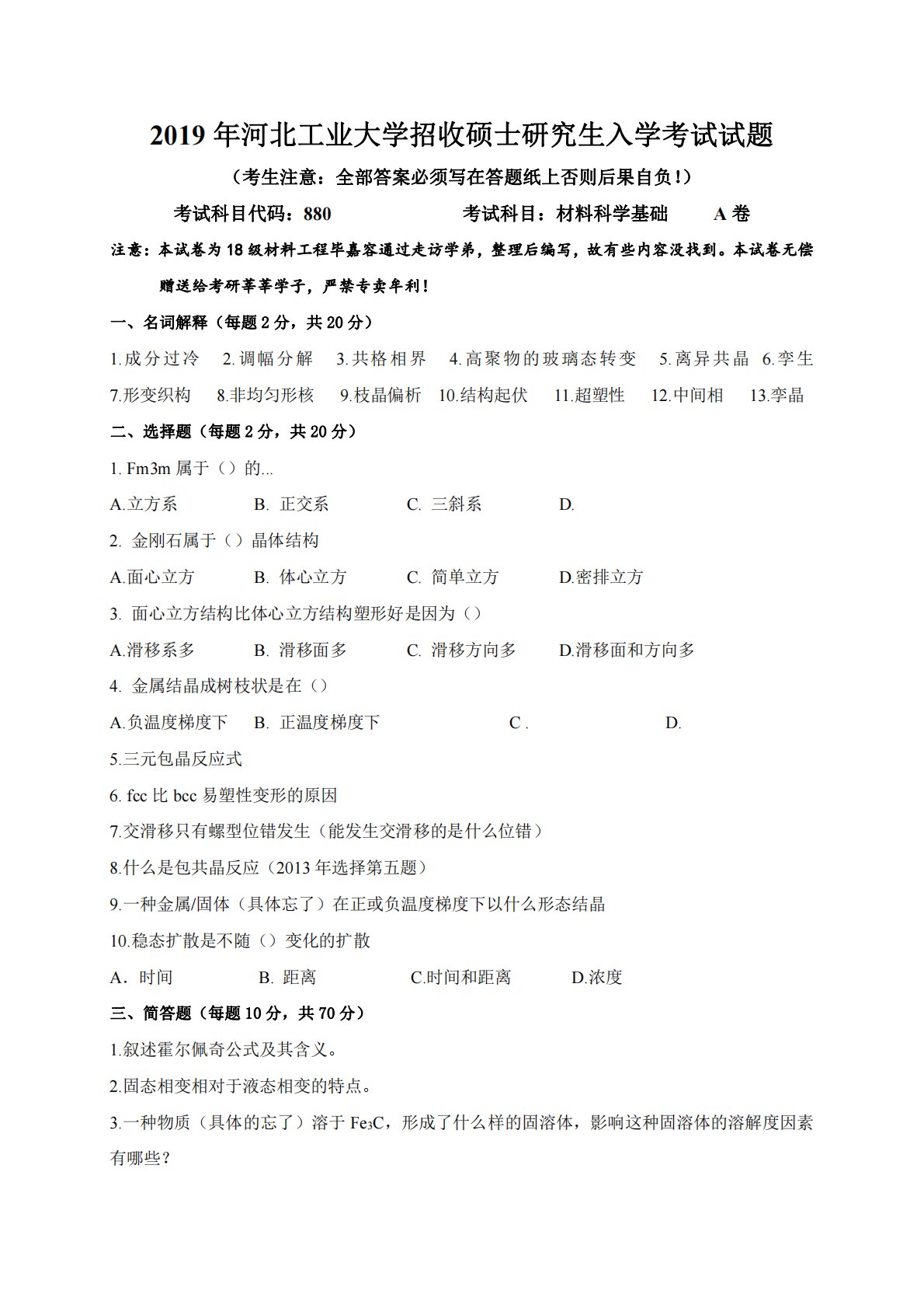 2019年河北工业大学招收硕士研究生入学考试试题(考生注意:全部答案必须写在答题纸上否则后果自负!)考试科目代码:880考试科目:材料科学基础A卷注意:本试卷为18级材料工程毕嘉容通过走访学弟,整理后编写,故有些内容没找到。本试卷无偿赠送给考研莘莘学子,严禁专卖牟利!一、名词解释(每题2分,共20分)1.成分过冷2.调幅分解3.共格相界4.高聚物的玻璃态转变5.离异共晶6.孪生7.形变织构8.非均匀形核9.枝晶偏析10.结构起伏11.超塑性12.中间相13.孪晶二、选择题(每题2分,共20分)1.Fm3m属于()的...A.立方系B.正交系C.三斜系D.2.金刚石属于()晶体结构A.面心立方B...