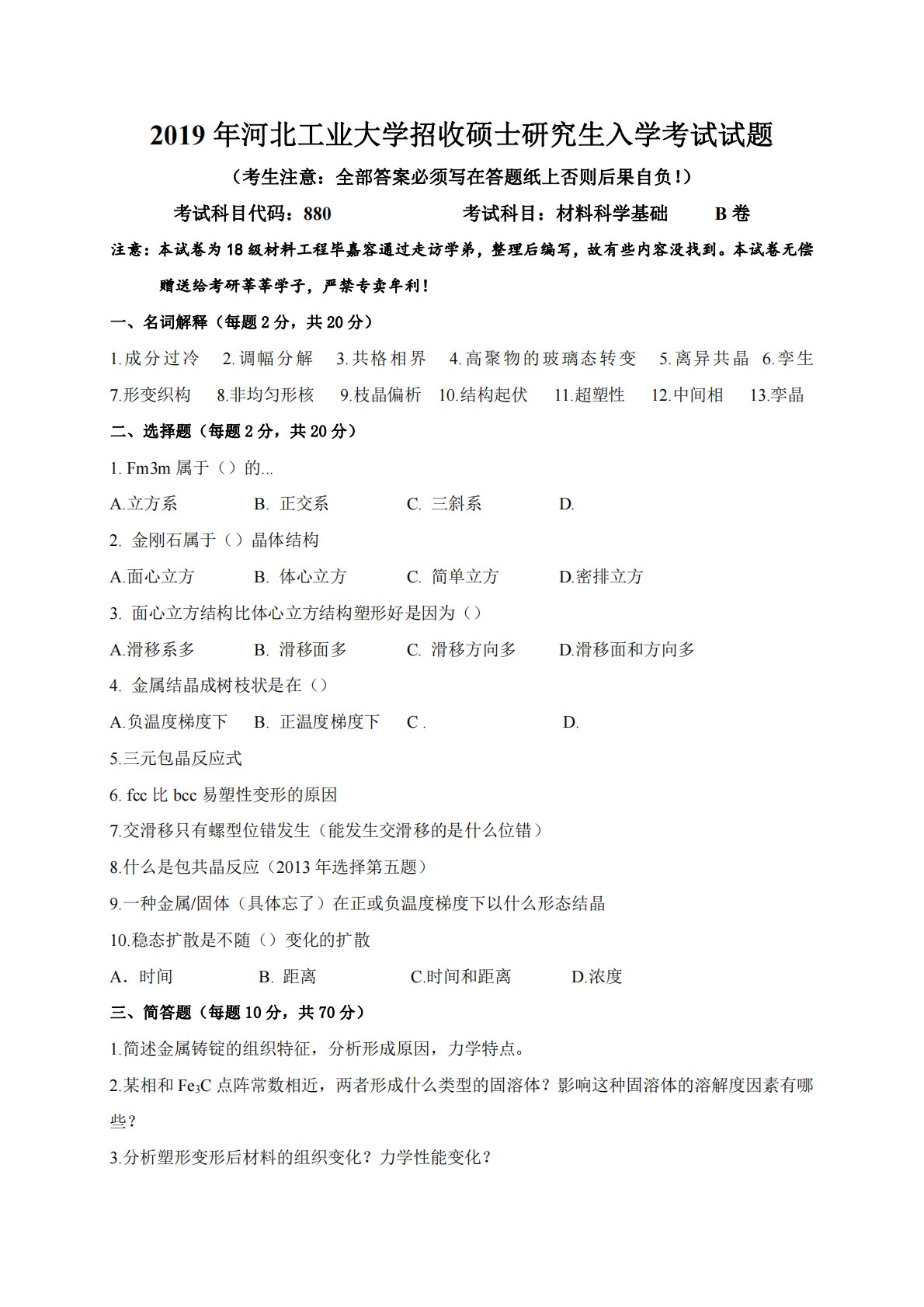 2019年河北工业大学招收硕士研究生入学考试试题(考生注意:全部答案必须写在答题纸上否则后果自负!)考试科目代码:880考试科目:材料科学基础B卷注意:本试卷为18级材料工程毕嘉容通过走访学弟,整理后编写,故有些内容没找到。本试卷无偿赠送给考研莘莘学子,严禁专卖牟利!一、名词解释(每题2分,共20分)1.成分过冷2.调幅分解3.共格相界4.高聚物的玻璃态转变5.离异共晶6.孪生7.形变织构8.非均匀形核9.枝晶偏析10.结构起伏11.超塑性12.中间相13.孪晶二、选择题(每题2分,共20分)1.Fm3m属于()的...A.立方系B.正交系C.三斜系D.2.金刚石属于()晶体结构A.面心立方B...