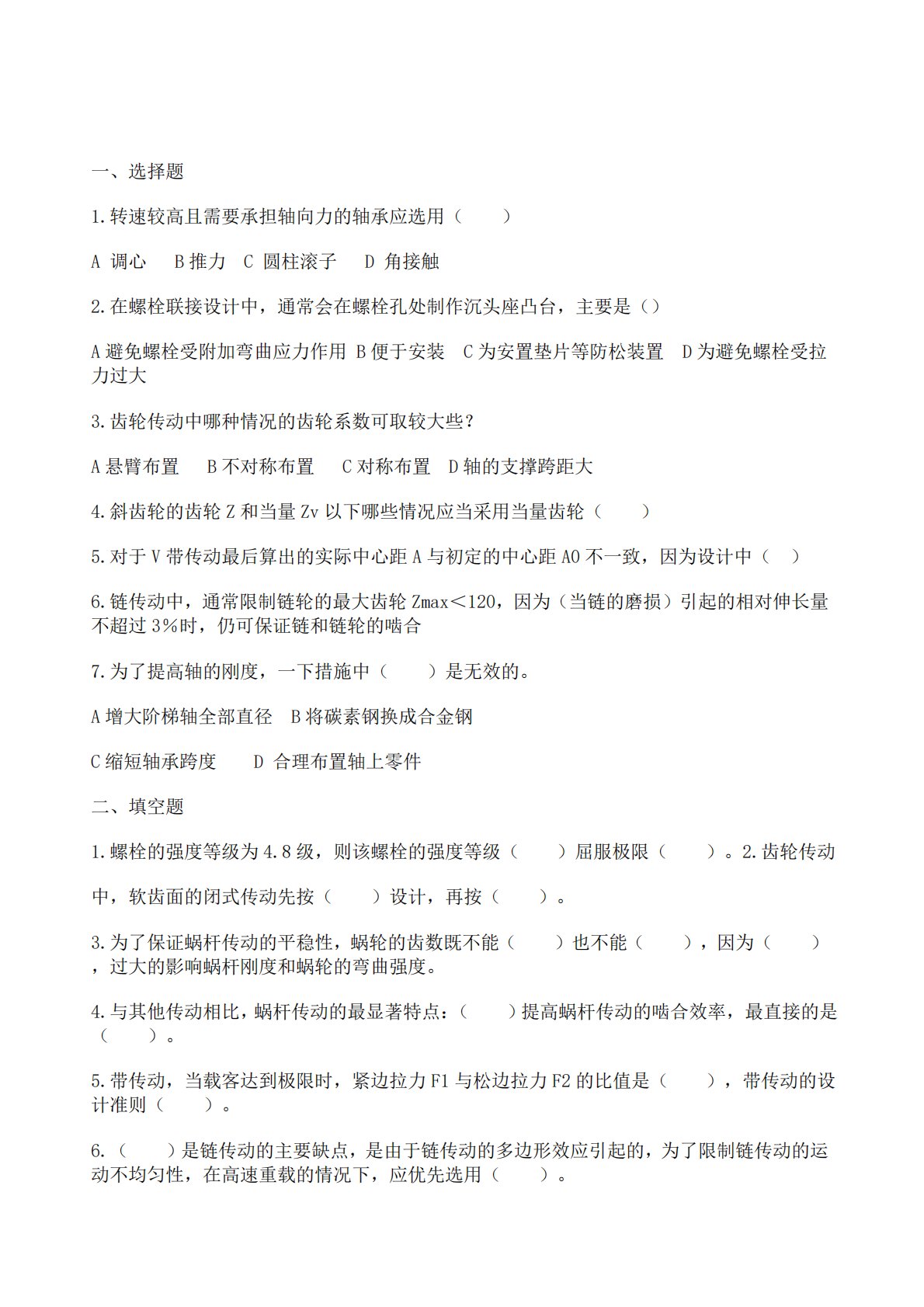 一、选择题1.转速较高且需要承担轴向力的轴承应选用()A调心B推力C圆柱滚子D角接触2.在螺栓联接设计中,通常会在螺栓孔处制作沉头座凸台,主要是()A避免螺栓受附加弯曲应力作用B便于安装C为安置垫片等防松装置D为避免螺栓受拉力过大3.齿轮传动中哪种情况的齿轮系数可取较大些?A悬臂布置B不对称布置C对称布置D轴的支撑跨距大4.斜齿轮的齿轮Z和当量Zv以下哪些情况应当采用当量齿轮()5.对于V带传动最后算出的实际中心距A与初定的中心距A0不一致,因为设计中()6.链传动中,通常限制链轮的最大齿轮Zmax<120,因为(当链的磨损)引起的相对伸长量不超过3%时,仍可保证链和链轮的啮合7.为了提高轴...