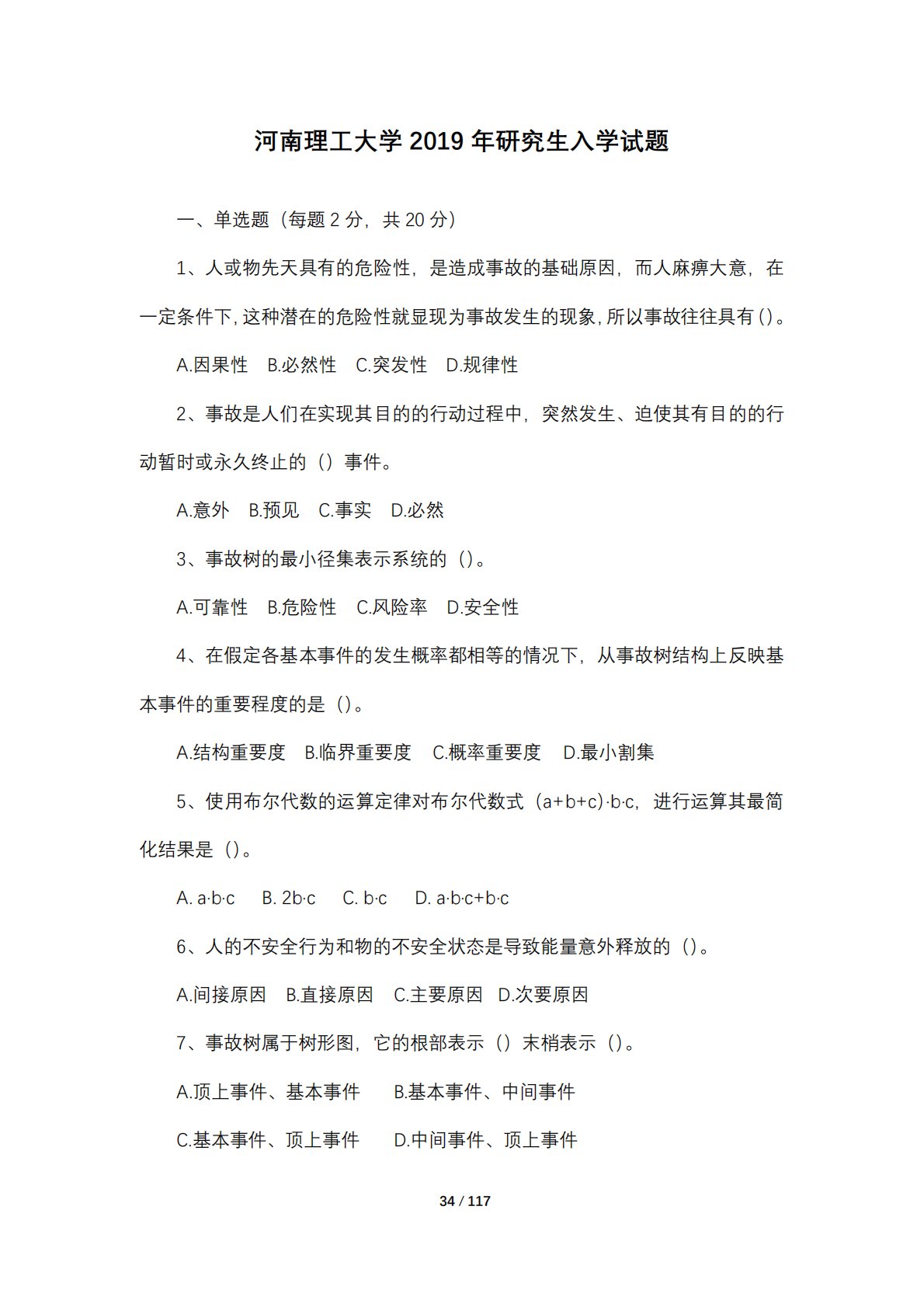 34/117河南理工大学2019年研究生入学试题一、单选题(每题2分,共20分)1、人或物先天具有的危险性,是造成事故的基础原因,而人麻痹大意,在一定条件下,这种潜在的危险性就显现为事故发生的现象,所以事故往往具有()。A.因果性B.必然性C.突发性D.规律性2、事故是人们在实现其目的的行动过程中,突然发生、迫使其有目的的行动暂时或永久终止的()事件。A.意外B.预见C.事实D.必然3、事故树的最小径集表示系统的()。A.可靠性B.危险性C.风险率D.安全性4、在假定各基本事件的发生概率都相等的情况下,从事故树结构上反映基本事件的重要程度的是()。A.结构重要度B.临界重要度C.概率重要度D....