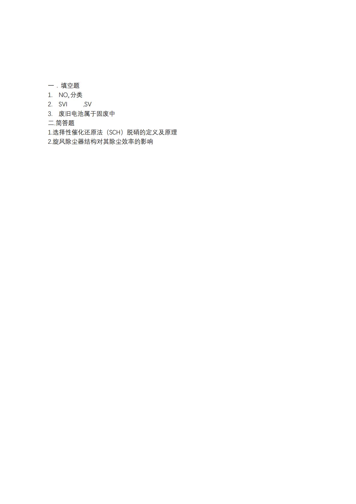 一.填空题1.NOx分类2.SVI,SV3.废旧电池属于固废中二.简答题1.选择性催化还原法(SCH)脱硝的定义及原理2.旋风除尘器结构对其除尘效率的影响一.填空题1.NOx分类2.SVI,SV3.废旧电池属于固废中二.简答题1.选择性催化还原法(SCH)脱硝的定义及原理2.旋风除尘器结构对其除尘效率的影响3.石灰石湿法烟气脱硫4.焚烧的定义及过程5.影响焚烧的因素有哪些(3T+E)6.分析堆肥过程中的主要影响因素7.湿法脱硫8.比较好氧生物和厌氧生物优缺点9.影响厌氧消化的主要因素三.计算题1.计算重力沉降室2.去除率和曝气池四.论述题1.湿法脱硫工艺中指出错在哪里2.生化废水处理加葡萄糖目...