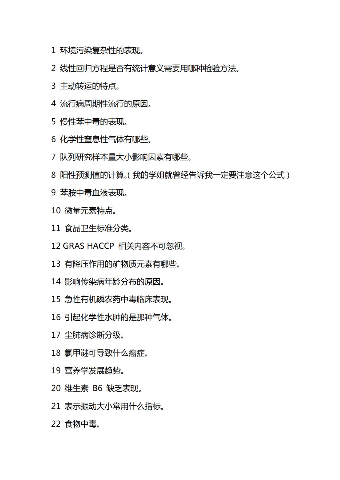1环境污染复杂性的表现。2线性回归方程是否有统计意义需要用哪种检验方法。3主动转运的特点。4流行病周期性流行的原因。5慢性苯中毒的表现。6化学性窒息性气体有哪些。7队列研究样本量大小影响因素有哪些。8阳性预测值的计算。(我的学姐就曾经告诉我一定要注意这个公式)9苯胺中毒血液表现。10微量元素特点。11食品卫生标准分类。12GRASHACCP相关内容不可忽视。13有降压作用的矿物质元素有哪些。14影响传染病年龄分布的原因。15急性有机磷农药中毒临床表现。16引起化学性水肿的是那种气体。17尘肺病诊断分级。18氯甲谜可导致什么癌症。19营养学发展趋势。20维生素B6缺乏表现。21表示振动大小常用什...