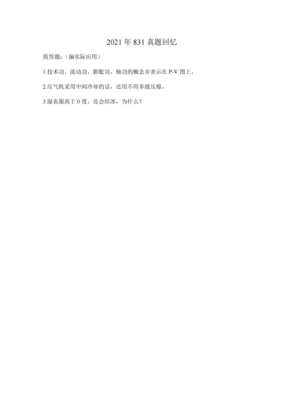 2021年831真题回忆简答题:(偏实际应用)1.技术功,流动功,膨胀功,轴功的概念并表示在P-V图上。2.压气机采用中间冷却的话,还用不用多级压缩。3.湿衣服高于0度,还会结冰,为什么?2021年831真题回忆简答题:(偏实际应用)1.技术功,流动功,膨胀功,轴功的概念并表示在P-V图上。2.压气机采用中间冷却的话,还用不用多级压缩。3.湿衣服高于0度,还会结冰,为什么?计算题(6个)1.4级压缩,求压缩比,耗功。(和第四版课本例题8-2差不多)2.不同质量不同温度的水混合,求此过程熵变。3.逆向布雷顿压缩空气制冷循环(制冷量,放热量,循环净功,制冷系数)4.多变过程求指数,判断是吸热还是放...