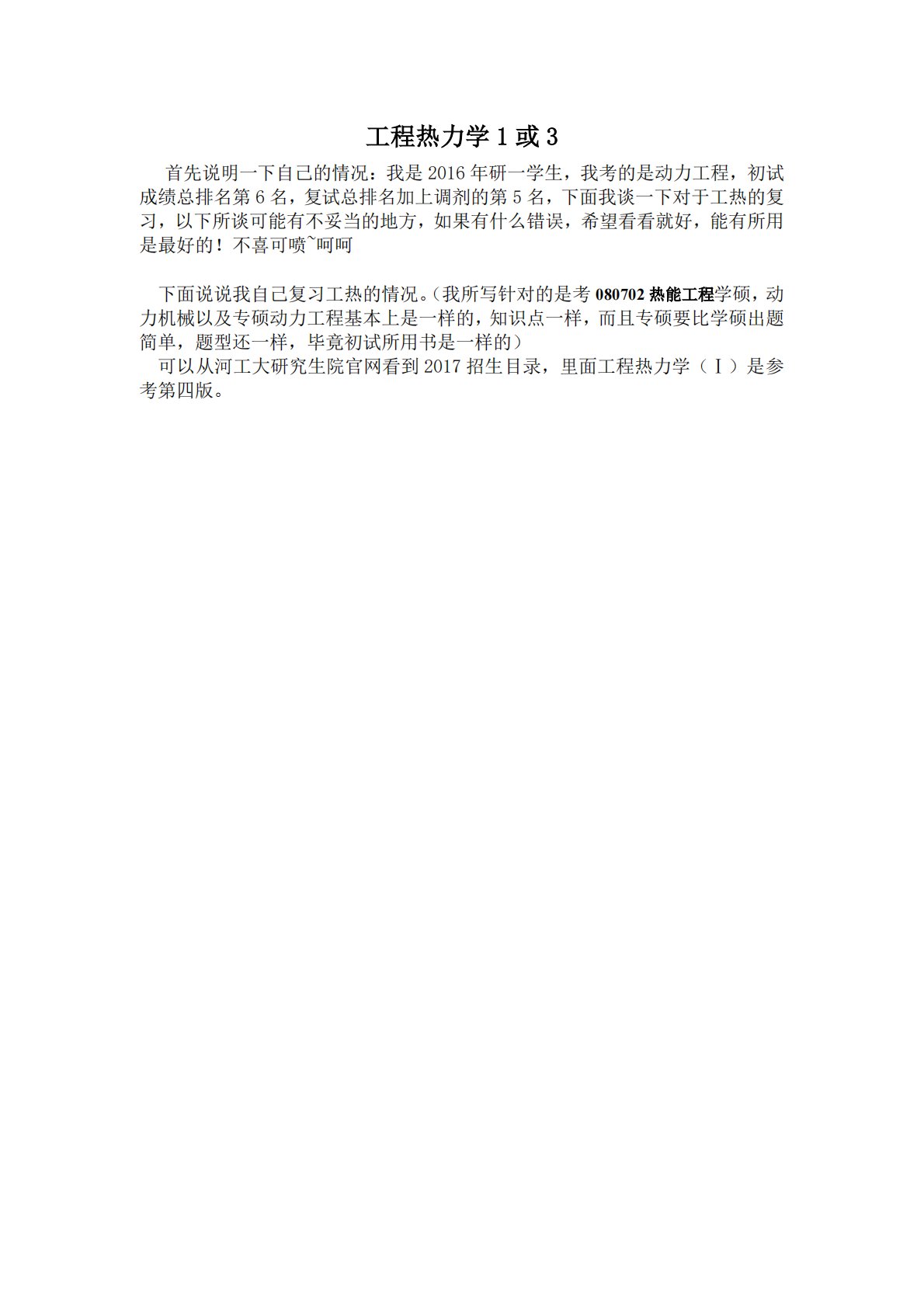 工程热力学1或3首先说明一下自己的情况:我是2016年研一学生,我考的是动力工程,初试成绩总排名第6名,复试总排名加上调剂的第5名,下面我谈一下对于工热的复习,以下所谈可能有不妥当的地方,如果有什么错误,希望看看就好,能有所用是最好的!不喜可喷~呵呵下面说说我自己复习工热的情况。(我所写针对的是考080702热能工程学硕,动力机械以及专硕动力工程基本上是一样的,知识点一样,而且专硕要比学硕出题简单,题型还一样,毕竟初试所用书是一样的)可以从河工大研究生院官网看到2017招生目录,里面工程热力学(Ⅰ)是参考第四版。工程热力学1或3首先说明一下自己的情况:我是2016年研一学生,我考的是动力工程,...