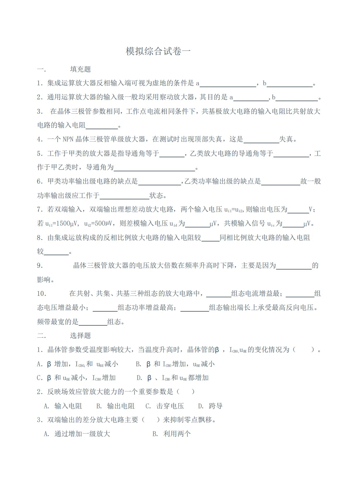 模拟综合试卷一一.填充题1.集成运算放大器反相输入端可视为虚地的条件是a,b。2.通用运算放大器的输入级一般均采用察动放大器,其目的是a,b。3.在晶体三极管参数相同,工作点电流相同条件下,共基极放大电路的输入电阻比共射放大电路的输入电阻。4.一个NPN晶体三极管单级放大器,在测试时出现顶部失真,这是失真。5.工作于甲类的放大器是指导通角等于,乙类放大电路的导通角等于,工作于甲乙类时,导通角为。6.甲类功率输出级电路的缺点是,乙类功率输出级的缺点是故一般功率输出级应工作于状态。7.若双端输入,双端输出理想差动放大电路,两个输入电压ui1=ui2,则输出电压为V;若ui1=1500µV,ui2=...