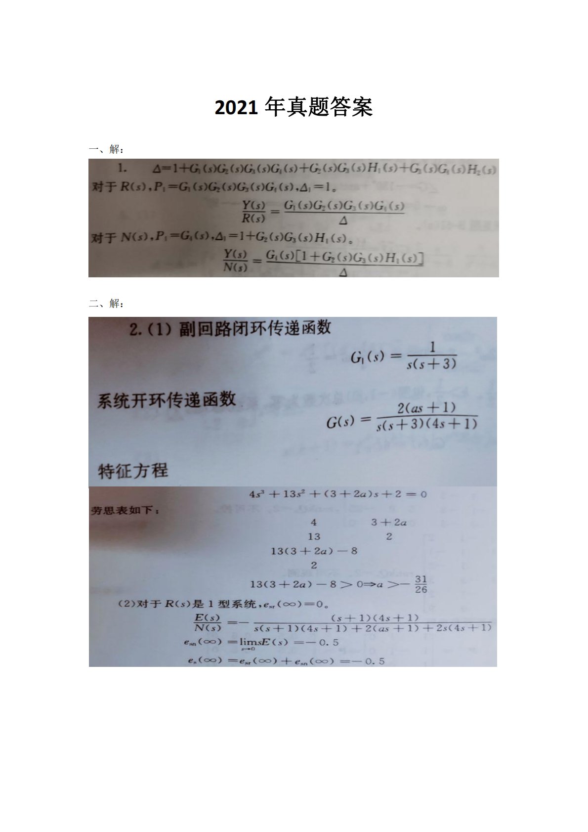 2021年真题答案一、解:二、解:三、解:设四、解:五、解:取补偿环节为六、解:368.0z368.1z18.7z368.0)z(2G七、解:4)(1AAN,)(1)j(ANG与的关系曲线如图所示,交点B对应自激振荡,对点B有:八、解:九、解:十、解:百校文库—海量高校资料共享库百校文库是一个线上大学生专业学习资料共享平台,致力于通过用户自主上传与分享,打造一个涵盖各大高校、各学科门类的免费资源中心。平台已积累50万+套历年真题与100万+条学习文档,覆盖绝大多数高校专业,所有资料均由各大高校学生自主上传。✅资料透明,直观预览新增全站资料目录功能,所有资源分类清晰、一目了然。...