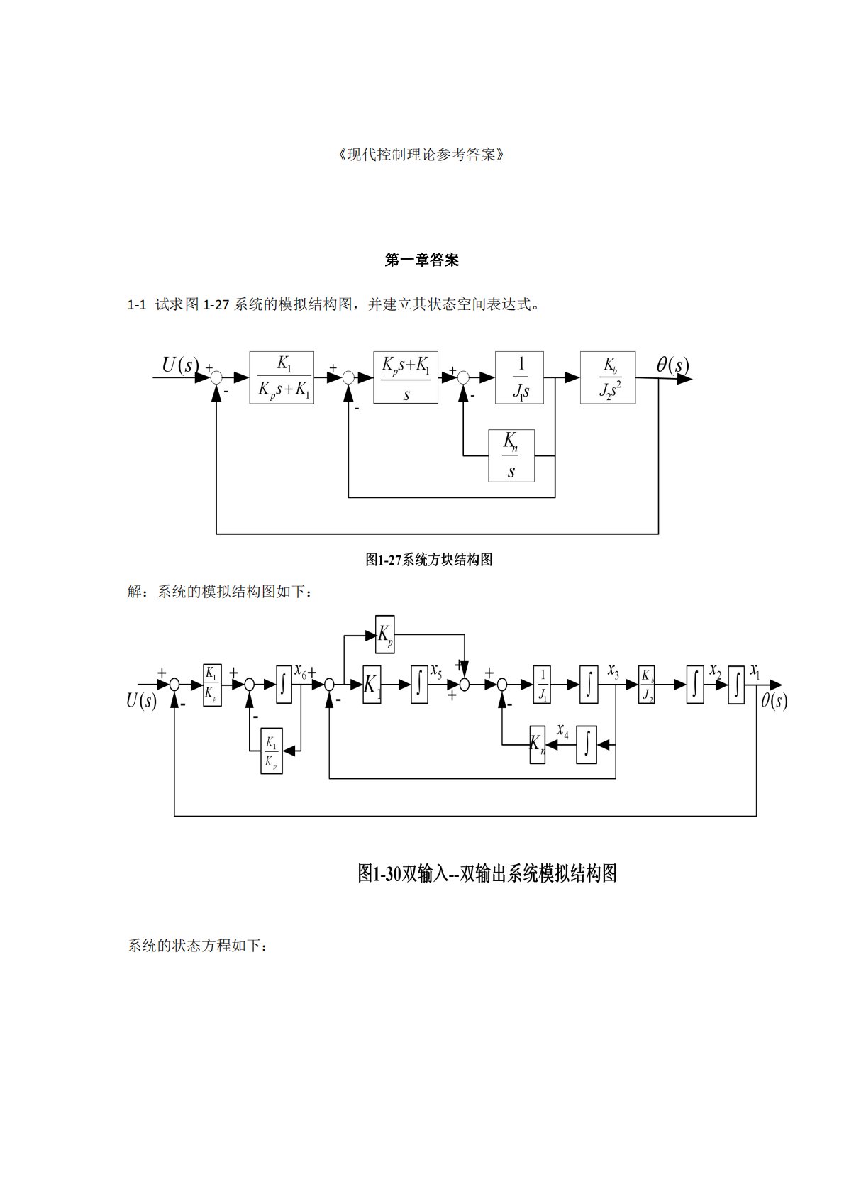 《现代控制理论参考答案》第一章答案1-1试求图1-27系统的模拟结构图,并建立其状态空间表达式。解:系统的模拟结构图如下:系统的状态方程如下:uKKxKKxKKxXKxKxxxxJKxJxJKxJKxxJKxxxppppnpb1611166131534615141313322211令ys)(,则1xy所以,系统的状态空间表达式及输出方程表达式为...