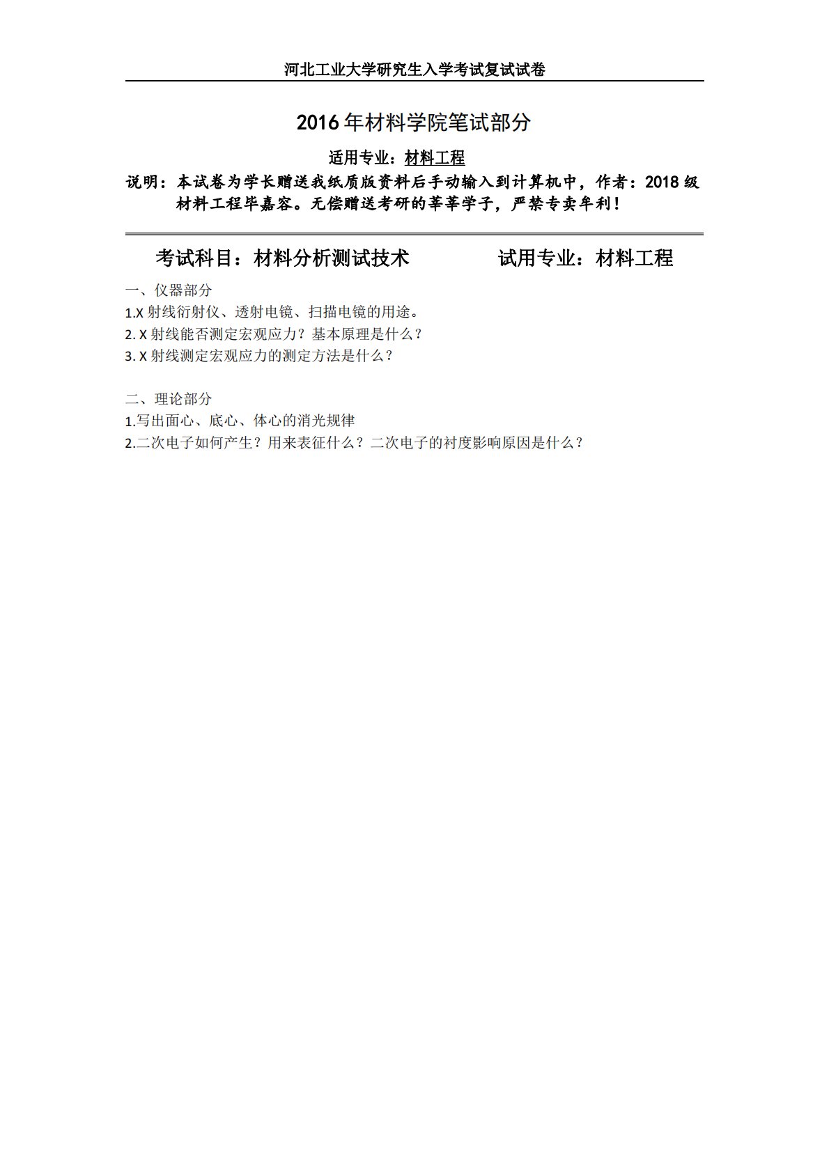 河北工业大学研究生入学考试复试试卷2016年材料学院笔试部分适用专业:材料工程说明:本试卷为学长赠送我纸质版资料后手动输入到计算机中,作者:2018级材料工程毕嘉容。无偿赠送考研的莘莘学子,严禁专卖牟利!考试科目:材料分析测试技术试用专业:材料工程一、仪器部分1.X射线衍射仪、透射电镜、扫描电镜的用途。2.X射线能否测定宏观应力?基本原理是什么?3.X射线测定宏观应力的测定方法是什么?二、理论部分1.写出面心、底心、体心的消光规律2.二次电子如何产生?用来表征什么?二次电子的衬度影响原因是什么?河北工业大学研究生入学考试复试试卷2016年材料学院笔试部分适用专业:材料工程说明:本试卷为学长赠送...