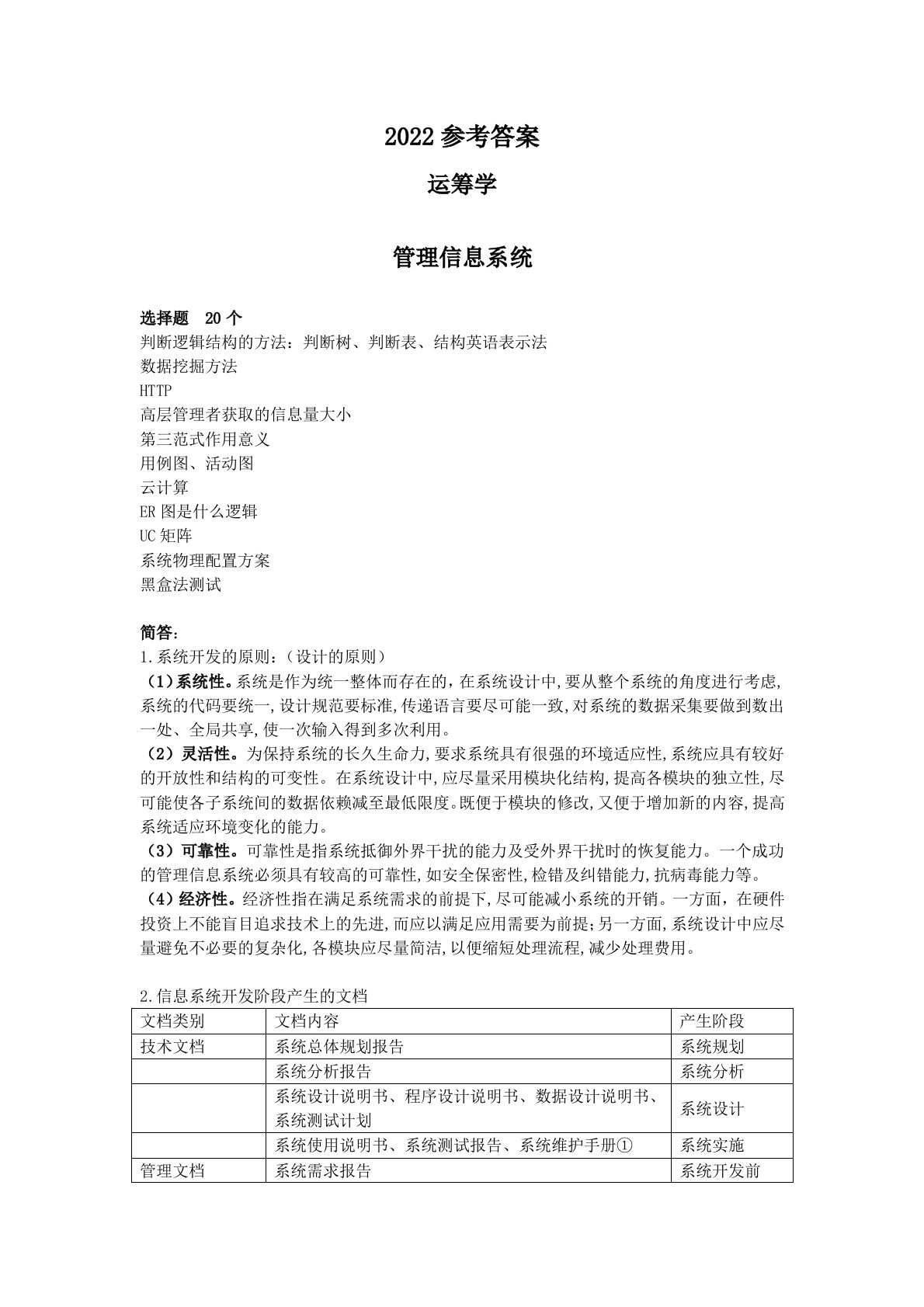 2022参考答案运筹学管理信息系统选择题20个判断逻辑结构的方法:判断树、判断表、结构英语表示法数据挖掘方法HTTP高层管理者获取的信息量大小第三范式作用意义用例图、活动图云计算ER图是什么逻辑UC矩阵系统物理配置方案黑盒法测试简答:1.系统开发的原则:(设计的原则)(1)系统性。系统是作为统一整体而存在的,在系统设计中,要从整个系统的角度进行考虑,系统的代码要统一,设计规范要标准,传递语言要尽可能一致,对系统的数据采集要做到数出一处、全局共享,使一次输入得到多次利用。(2)灵活性。为保持系统的长久生命力,要求系统具有很强的环境适应性,系统应具有较好的开放性和结构的可变性。在系统设计中,应尽量...