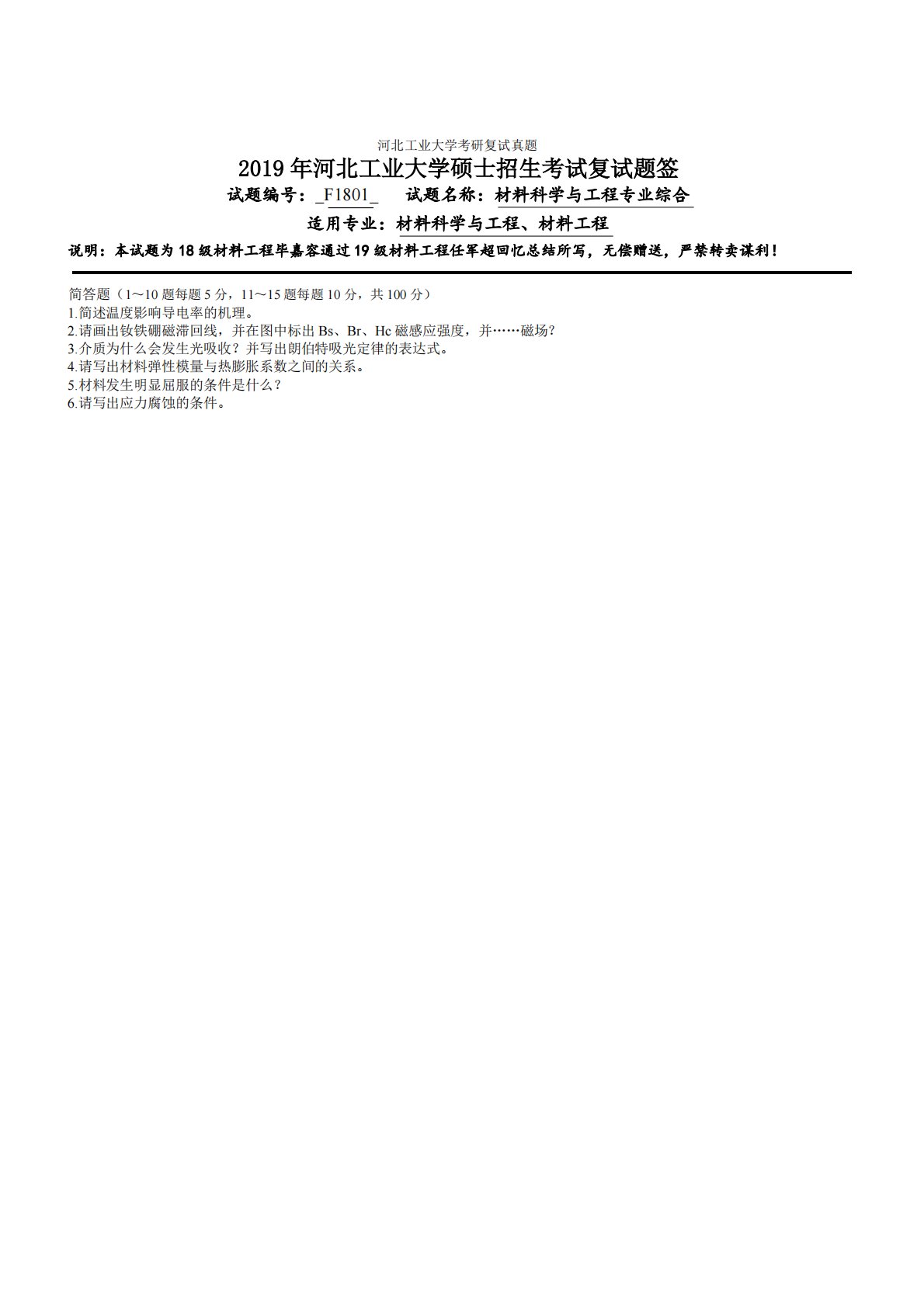 河北工业大学考研复试真题2019年河北工业大学硕士招生考试复试题签试题编号:_F1801_试题名称:材料科学与工程专业综合适用专业:材料科学与工程、材料工程说明:本试题为18级材料工程毕嘉容通过19级材料工程任军超回忆总结所写,无偿赠送,严禁转卖谋利!简答题(1~10题每题5分,11~15题每题10分,共100分)1.简述温度影响导电率的机理。2.请画出钕铁硼磁滞回线,并在图中标出Bs、Br、Hc磁感应强度,并……磁场?3.介质为什么会发生光吸收?并写出朗伯特吸光定律的表达式。4.请写出材料弹性模量与热膨胀系数之间的关系。5.材料发生明显屈服的条件是什么?6.请写出应力腐蚀的条件。河北工业大学...