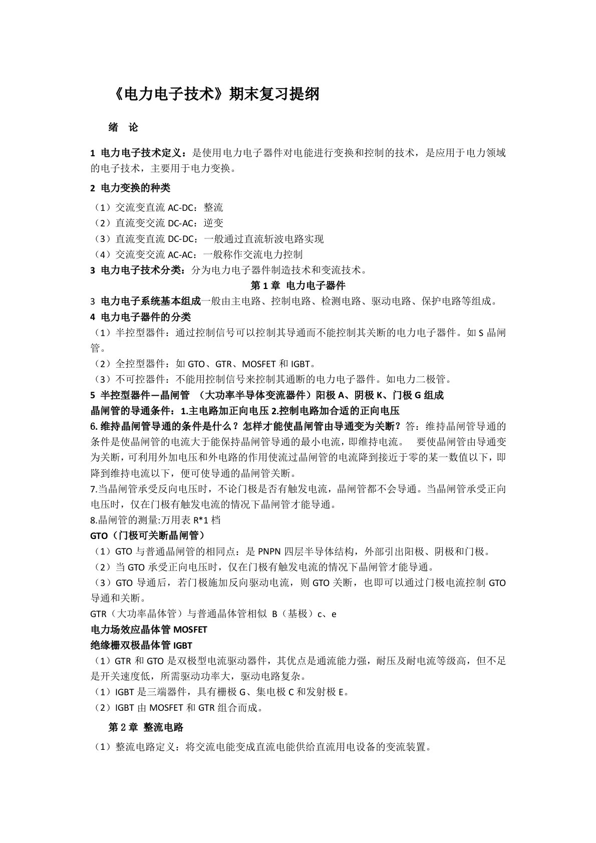 《电力电子技术》期末复习提纲绪论1电力电子技术定义:是使用电力电子器件对电能进行变换和控制的技术,是应用于电力领域的电子技术,主要用于电力变换。2电力变换的种类(1)交流变直流AC-DC:整流(2)直流变交流DC-AC:逆变(3)直流变直流DC-DC:一般通过直流斩波电路实现(4)交流变交流AC-AC:一般称作交流电力控制3电力电子技术分类:分为电力电子器件制造技术和变流技术。第1章电力电子器件3电力电子系统基本组成一般由主电路、控制电路、检测电路、驱动电路、保护电路等组成。4电力电子器件的分类(1)半控型器件:通过控制信号可以控制其导通而不能控制其关断的电力电子器件。如S晶闸管。(2)全控型...