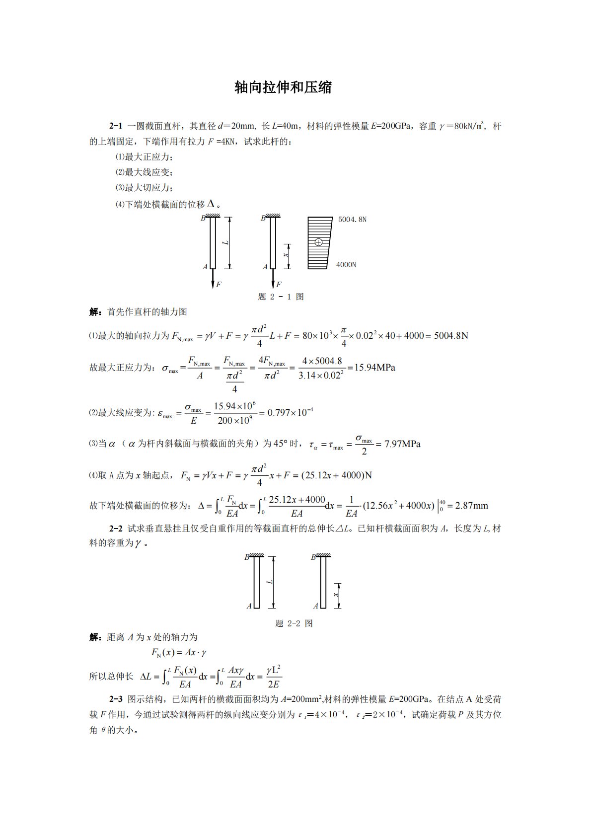 2-1一圆截面直杆,其直径d=20mm,长L=40m,材料的弹性模量E=200GPa,容重γ=80kN/m3,杆的上端固定,下端作用有拉力F=4KN,试求此杆的轴向拉伸和压缩:⑴最大正应力;⑵最大线应变;⑶最大切应力;⑷下端处横截面的位移。BA题2-1图LFBAxF+5004.8N4000N解:首先作直杆的轴力图⑴最大的轴向拉力为232N,max80100.024040005004.8N44dFVFLF故最大正应力为:N,maxN,maxN,maxmax222445004.8=15.94MPa3.140.024FFFAdd⑵最大线应变为:64m...