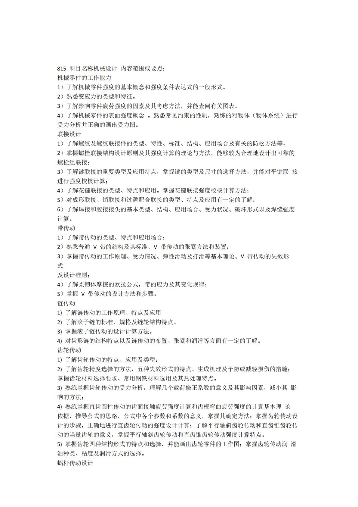 815科目名称机械设计内容范围或要点:机械零件的工作能力1)了解机械零件强度的基本概念和强度条件表达式的一般形式。2)熟悉变应力的类型和特征。3)了解影响零件疲劳强度的因素及其考虑方法,并能查阅有关图表。4)了解机械零件的表面强度概念。熟悉常见约束的性质,熟练的对物体(物体系统)进行受力分析并正确的画出受力图。联接设计1)了解螺纹及螺纹联接件的类型、特性、标准、结构、应用场合及有关的防松方法等,2)掌握螺栓联接结构设计原则及其强度计算的理论与方法,能够较为合理地设计出可靠的螺栓组联接;3)了解键联接的重要类型及应用特点,掌握键的类型及尺寸的选择方法,并能对平键联接进行强度校核计算;4)了解花键...